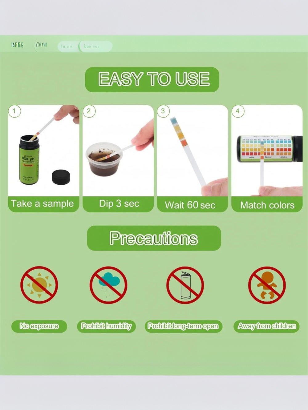 4.Efficient Testing Process: Quick and simple testing procedure—mix soil with water, wait, dip the strip, hold for 60 seconds, and compare with the provided color chart.