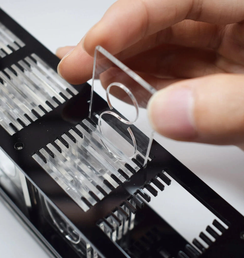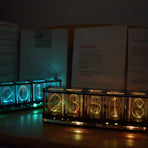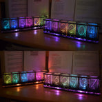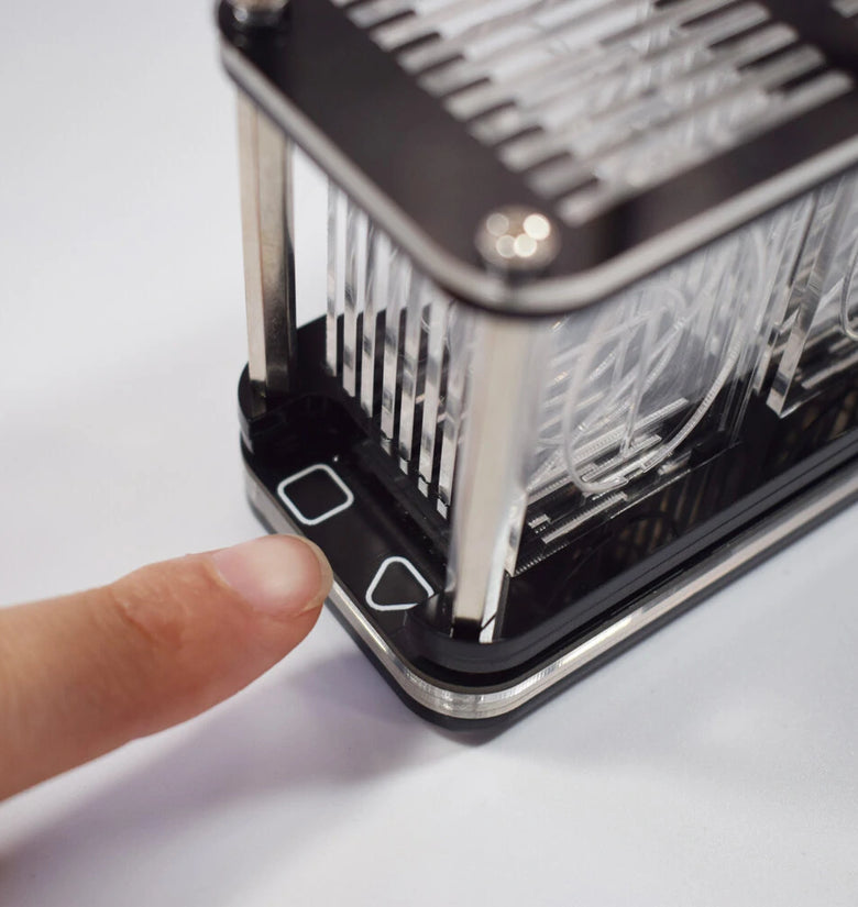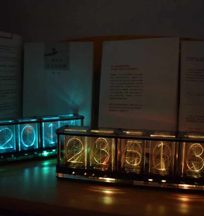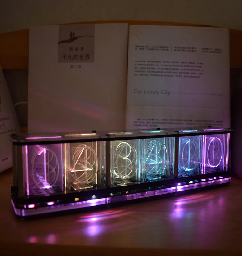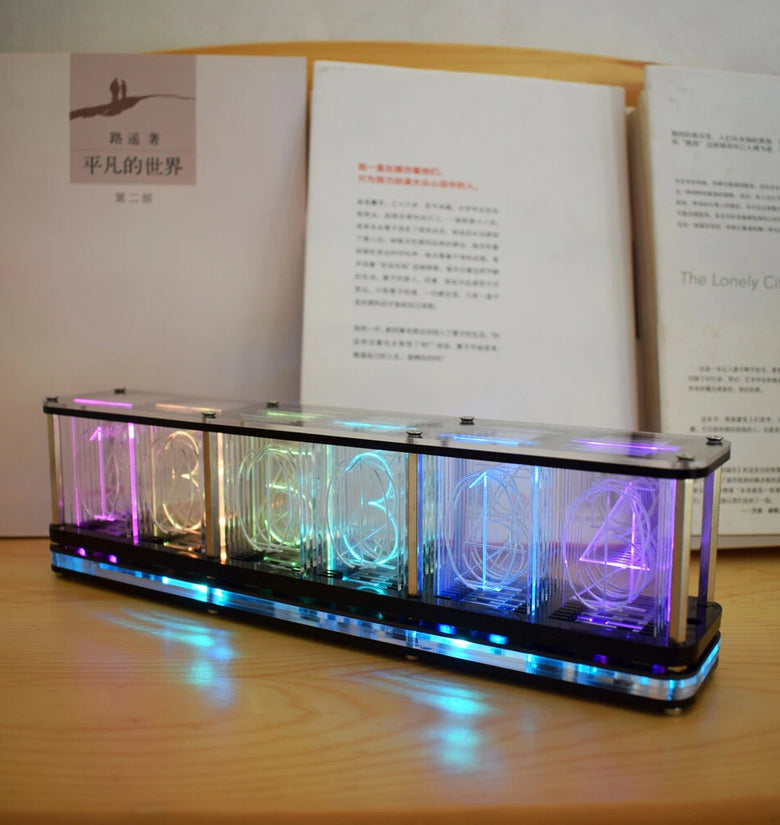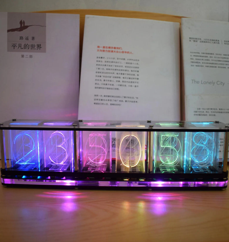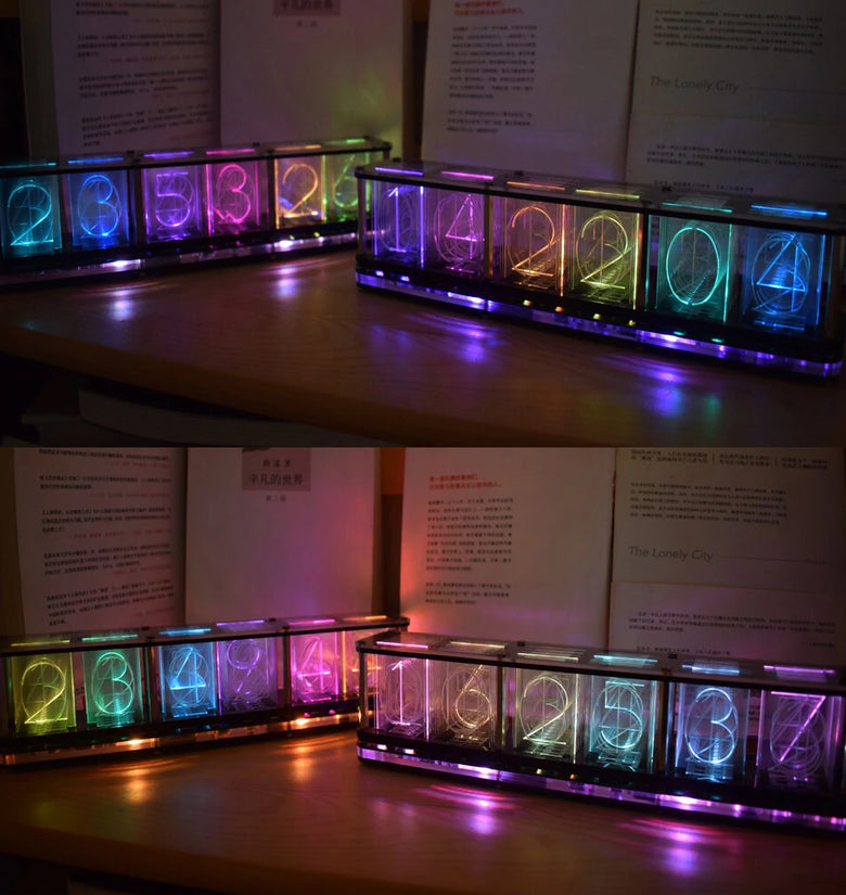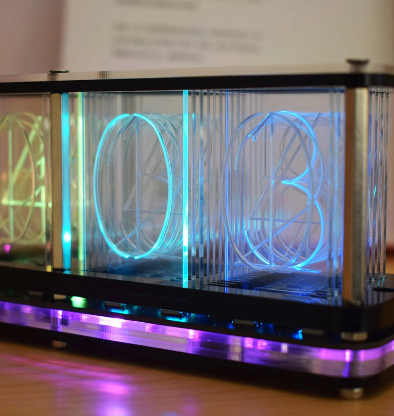 Different numbers are engraved on the transparent acrylic, and then the digital effect is refracted by the bright RGB lamp, which simulates the display effect of the fluorescent tube glow clock. Each number produces different gradient colors, forming rainbow colors and various aurora color effects. A side colored light effect is added at the bottom. There are a variety of time digital display animation effects and multiple switching animations.