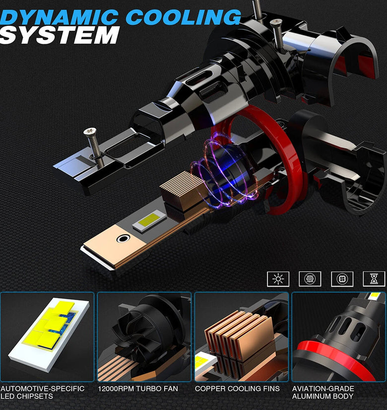 - Robust Cooling System: Equipped with a 12000RPM turbo fan and copper heat pipe, the headlight maintains optimal performance by effectively dissipating heat, ensuring stable illumination for long periods.