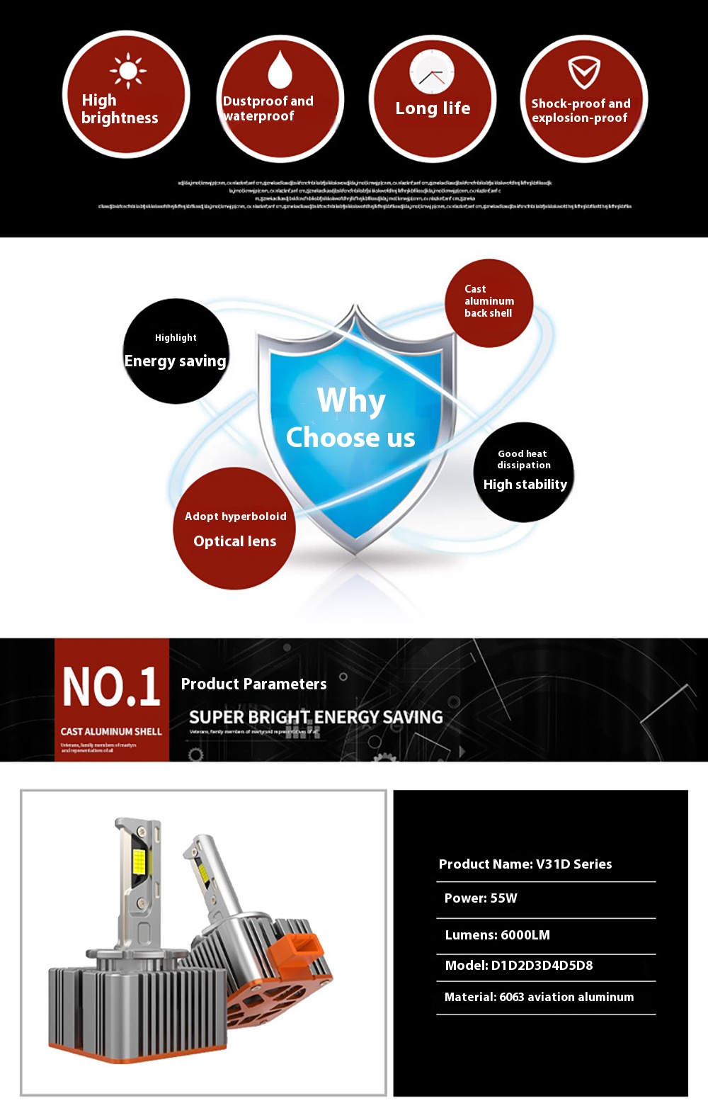 - High Brightness & Energy Efficiency: The V31 D Series boasts a powerful 6000LM output at only 55W. This high luminosity ensures clear visibility during night drives while being remarkably power-efficient, converting 99% of electrical energy into light.