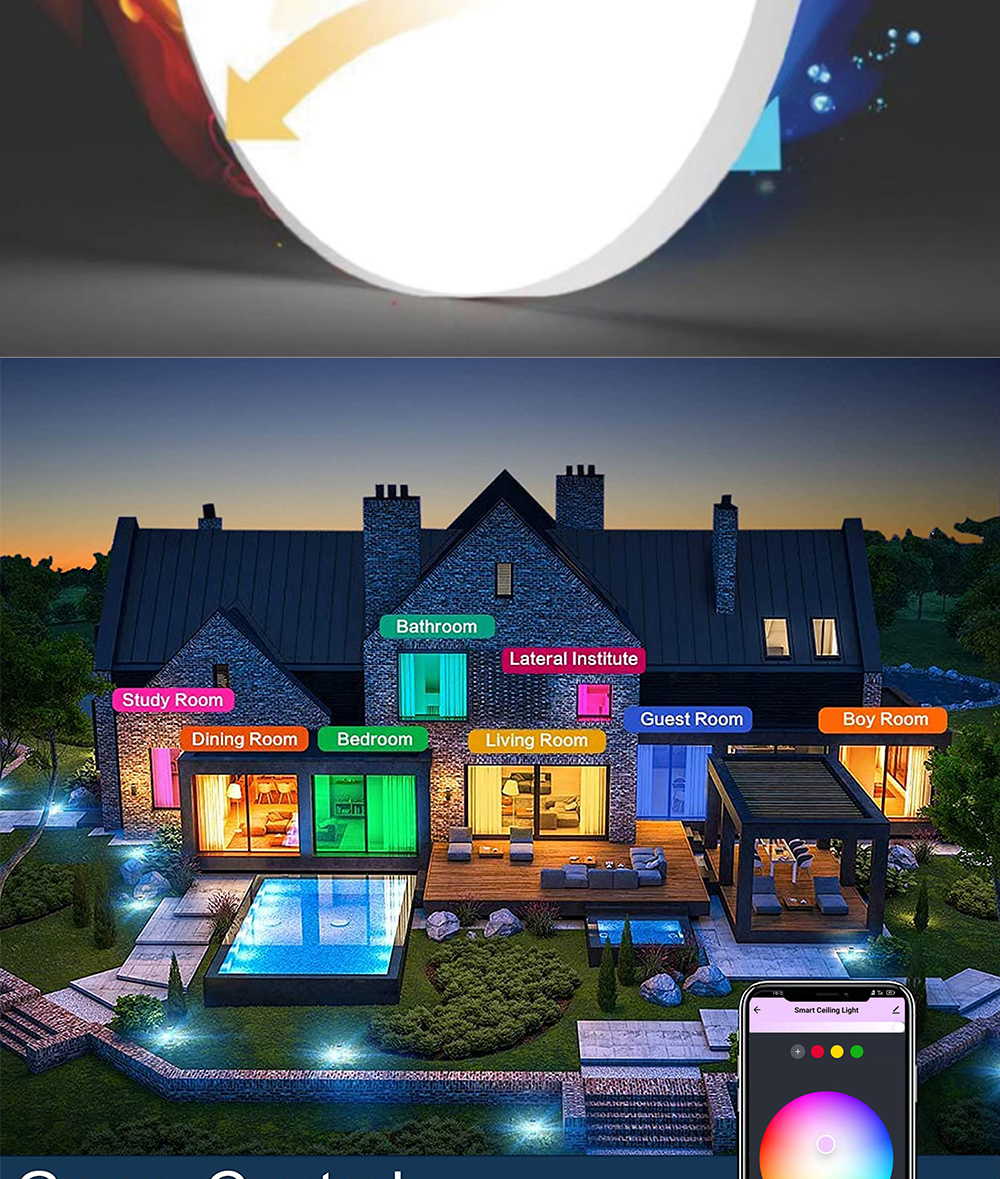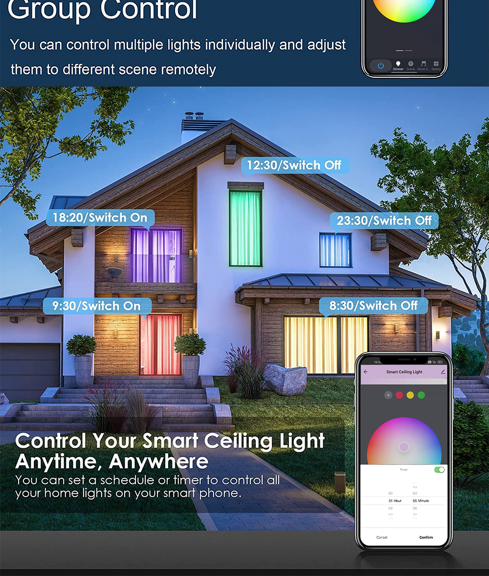 - Vibrant Color Range: With RGB+CW capabilities, this smart ceiling light offers a broad spectrum of colors, including warm to cool whites (2700K-6500K). Customize ambiance for any occasion, from cozy dinners to vibrant parties, with 16 million available hues.