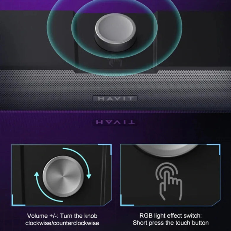 • Havit M19 Computer Speaker bluetooth Soundbar Dual 52mm Speakers Dual Bass Diaphragm RGB Light 3.5mm Wired Knob-type Desktop Speaker USB Power Supply
