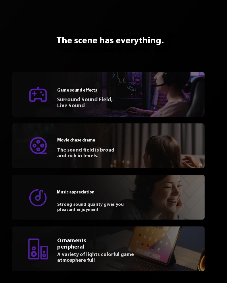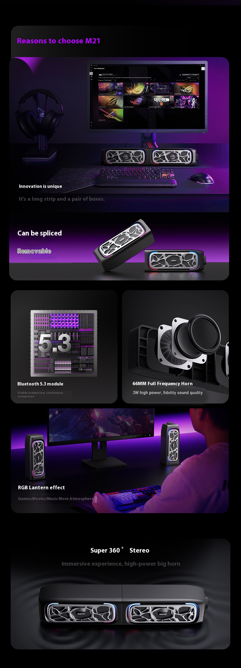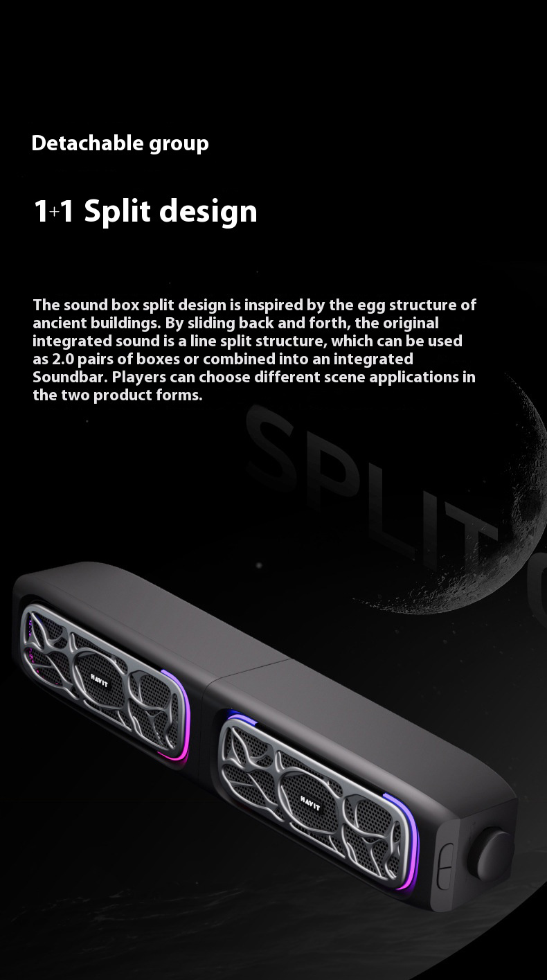 1. Split Design: Can be disassembled and combined for customizable surround sound effects.