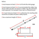 Notice:A must measure at least 11.5mm to fit onto the miter gauge.B must measure at least 3mm to accommodate the rubber ring. (If your table saw does not require a rubber ring, this restriction may be ignored—for example, if your saw is a Festool brand.)B+C must measure at least 6.5mm; otherwise, the resulting slide rod will be unusable and pose a safety hazard.E has a maximum length of 700mm.