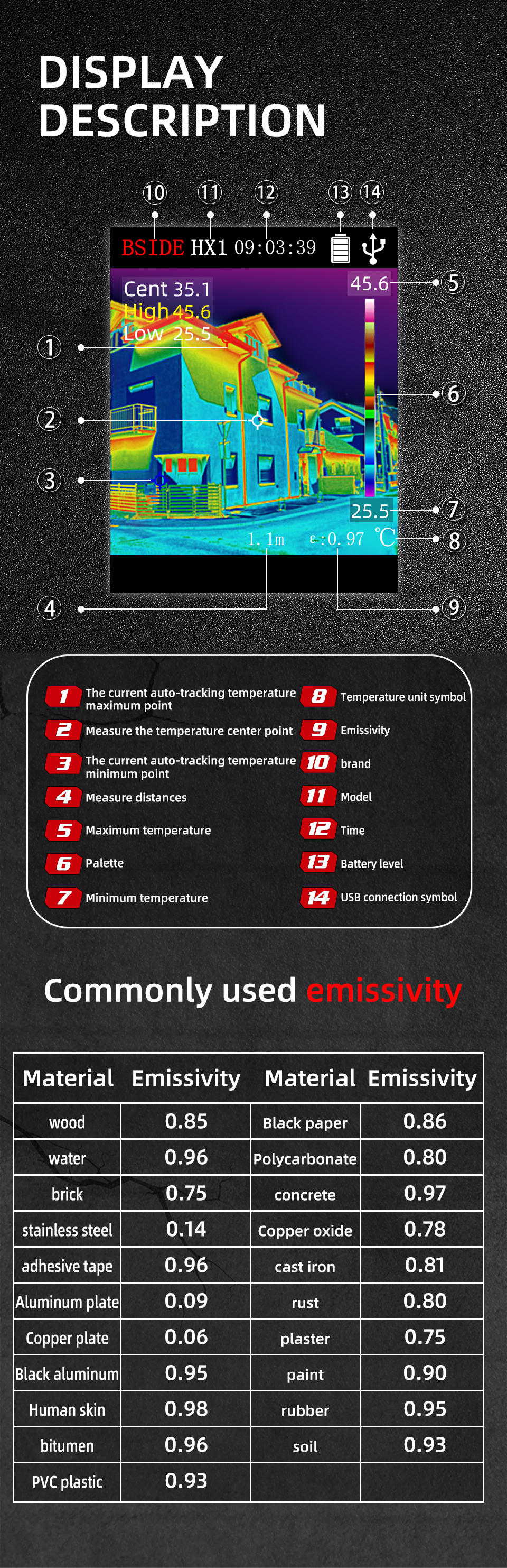Temperature Measurement Display: Center Point, Max/Min, and Adjustable Emissivity