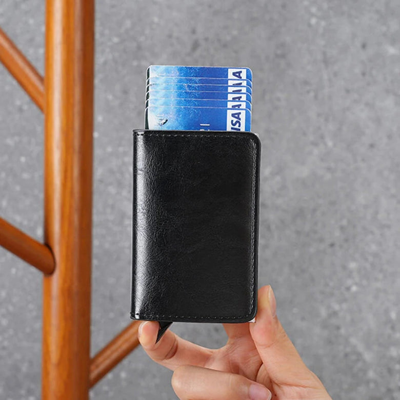1. STYLISH: This card holder is made of high quality PU leather and metal composite, long lasting, simple and fashionable appearance.2. CARD AUTOMATIC EJECTION: Press the button and the card pops out for easy access, saving time and effort.3. RFID PROTECTION: Ensure your cards are protected from unauthorized scanning with built-in RFID shielding technology.4. MULTIPLE SLOTS: This multi-functional card holder holds up to 6 cards, accommodating credit cards, ID cards, and more.5. COMPACT AND LIGHTWEIGHT: Slim design and lightweight construction make it easy to carry in your pocket or bag without adding bulk.