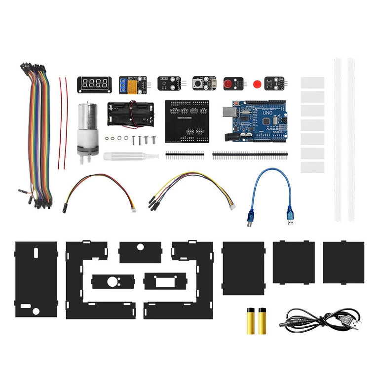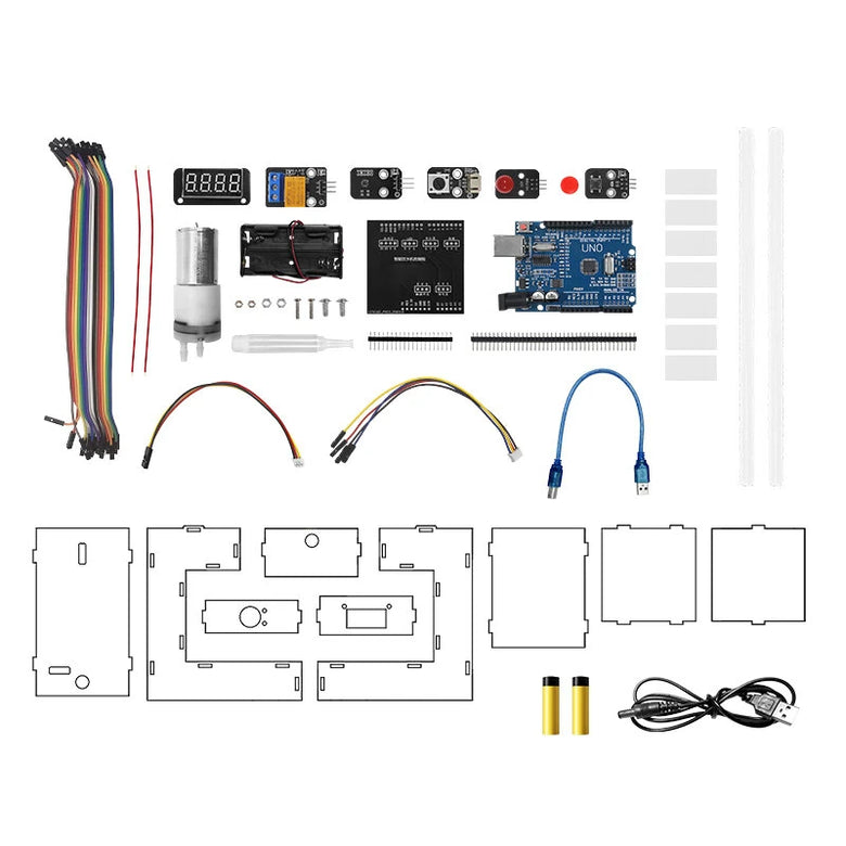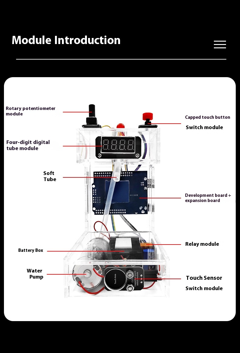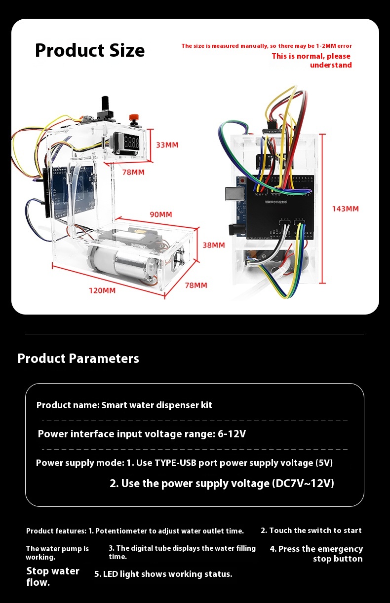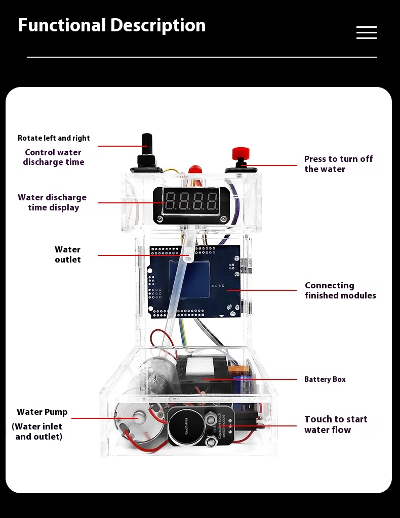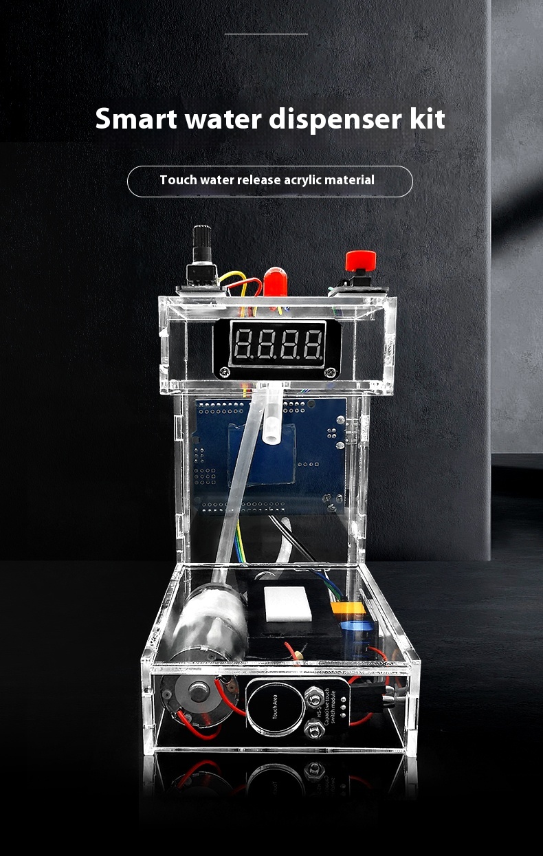 • Intelligent Water Dispenser Kit Adjustable Timing Touch Activated Digital Display Emergency Stop Button LED Status Indicator USB and DC Power Supply