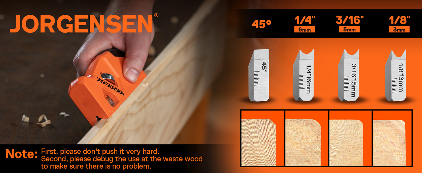 - Cutter Heads: 4 different shaped tips (45° flat, 1/4' round, 1/8' round, 3/16' round)
