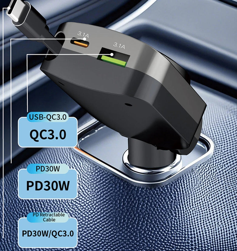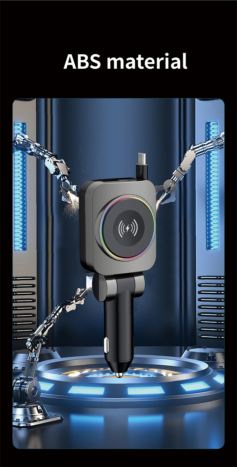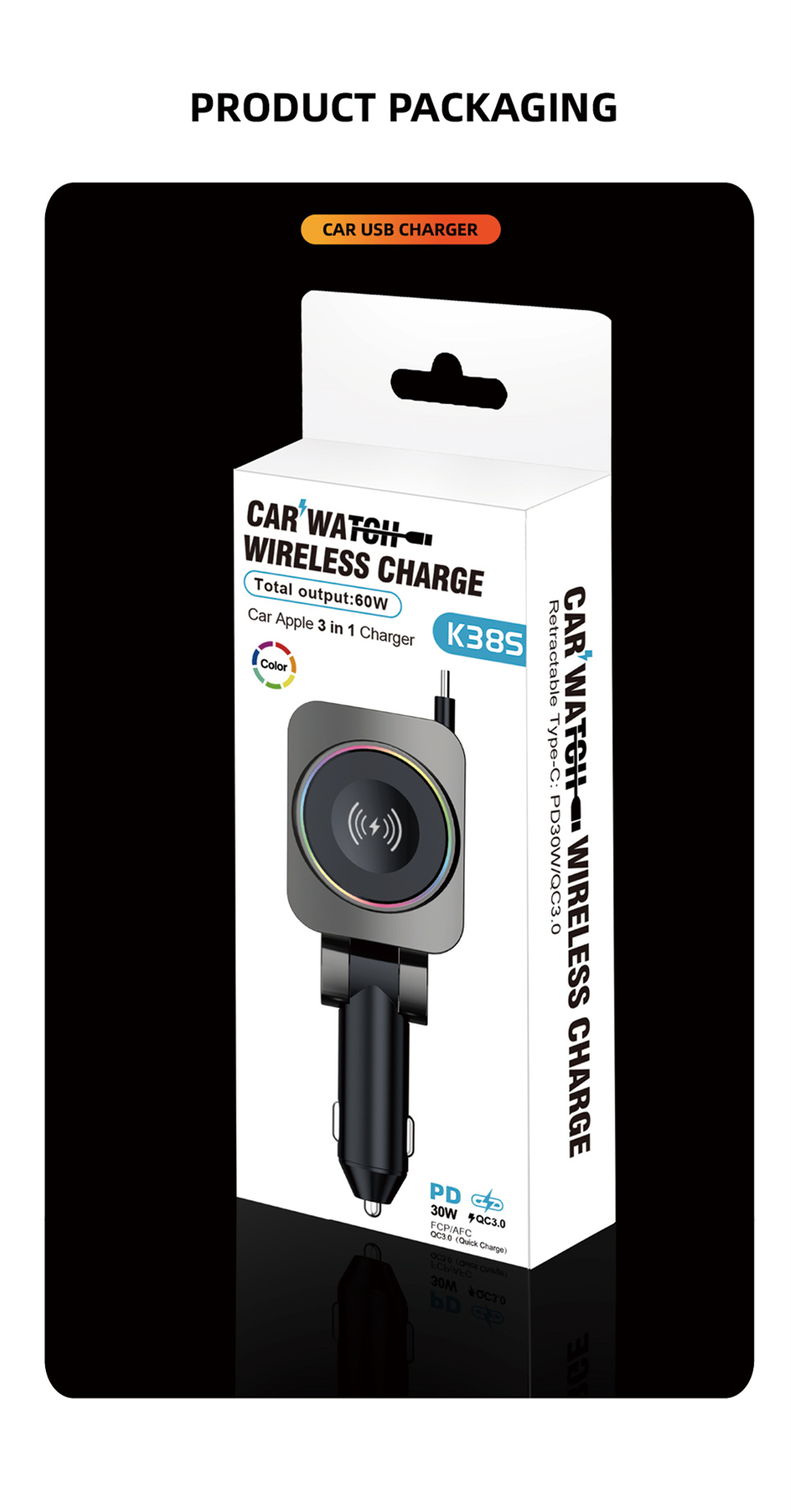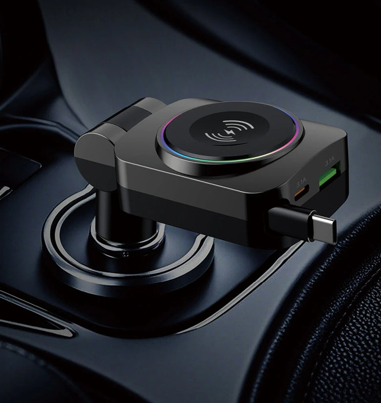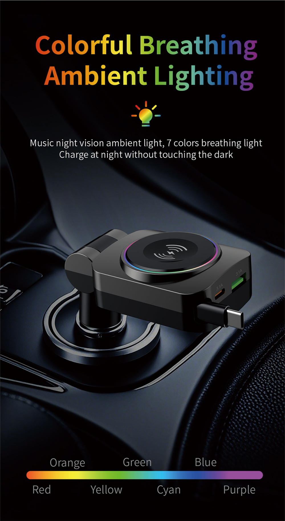 • K38S Retractable Cord Watch Wireless Charger Ambient Lighting PD30W QC3.0 3.1A Car USB Multi-Port for Mobile Phone Fast Charge Car Plug QC Adapter