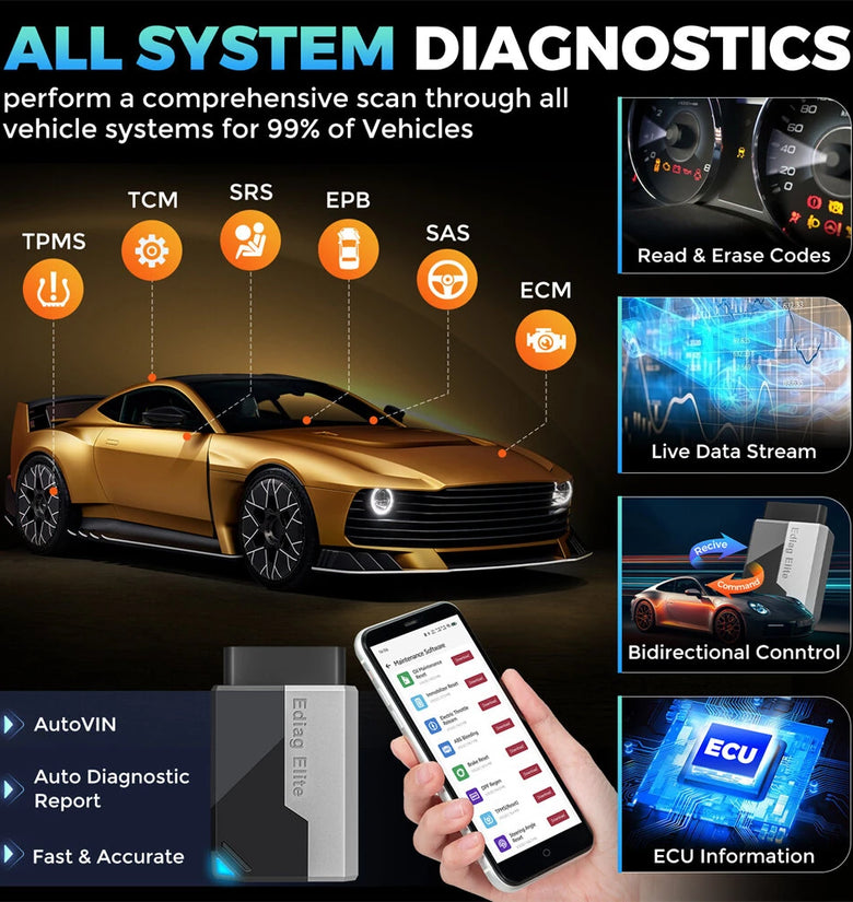 1. Comprehensive diagnostics for all vehicle systems, ensuring optimal performance across TPMS, ECM, ABS, and more.