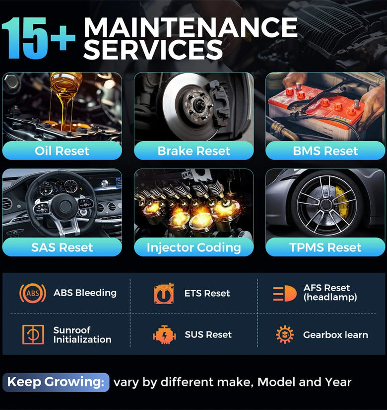 4. Supports 15+ essential maintenance services, including oil reset, injector coding, and ABS bleeding.