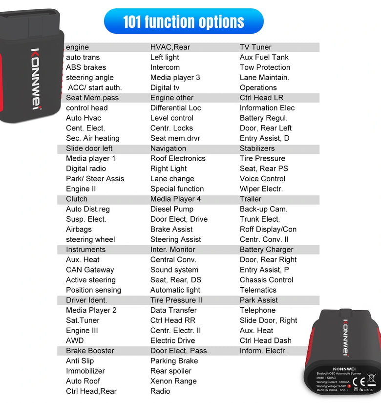 --KONNWEI KDIAG Bluetooth OBD2 scanner makes your smart device become a professional vehicle diagnostic tool, it compatible with android and ios system. Auto-VIN function supports the KDIAG identifies most car models automatically. Full system Vehicle health report will be automatically created after diagnosis, report can be shared. Live Data Stream combined Graphing+Data Record better for monitoring vehicle performance and analyze the abnormal parameter.