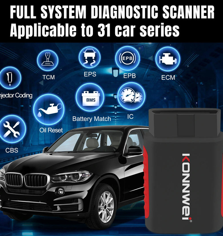 --KONNWEI KDIAG OBD2 Scanner supports all Systems diagnostic function, it can read/clear fault codes, read live data, read control module information, actuation tests and maintenance functions for ECM, BCM, SRS, TCM, BMS, TPMS, SAS, A/C system etc... It works with most car models after 1996 year of 120+ car brands, It is with free update anytime , it will be much valuable than other scanners in the market.