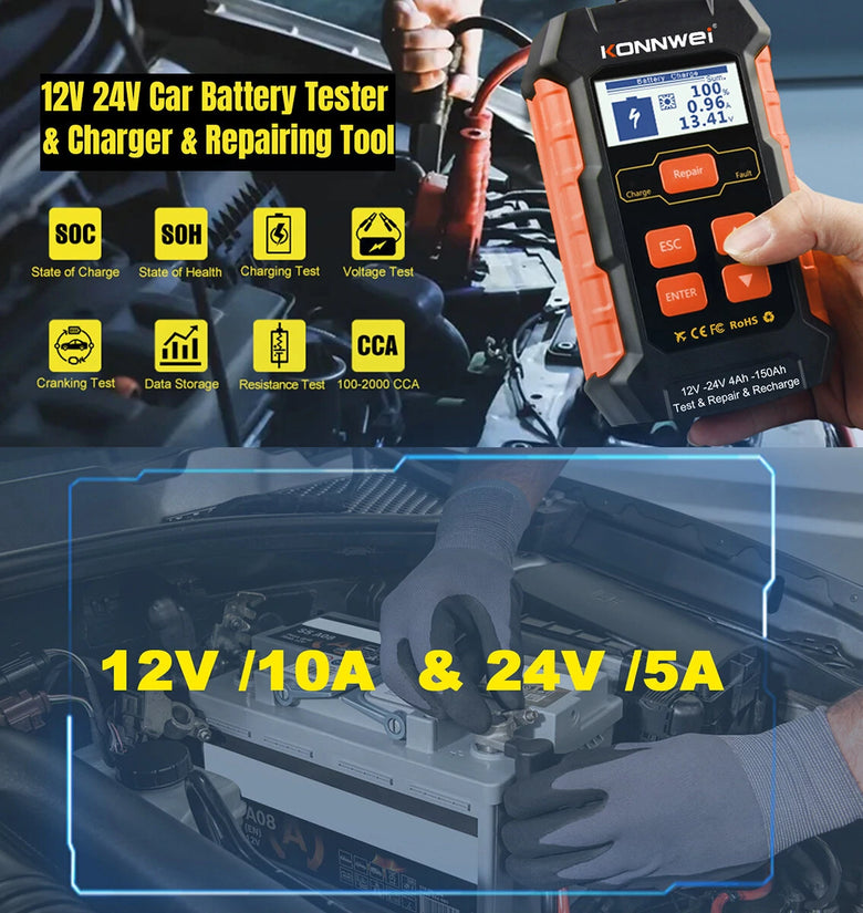 4.The KONNWEI KW520 12V 24V car battery tester is able to effectively analyze and read important car data such as voltage, internal resistance, cold cranking amp and AH capacity, battery health and charge status.