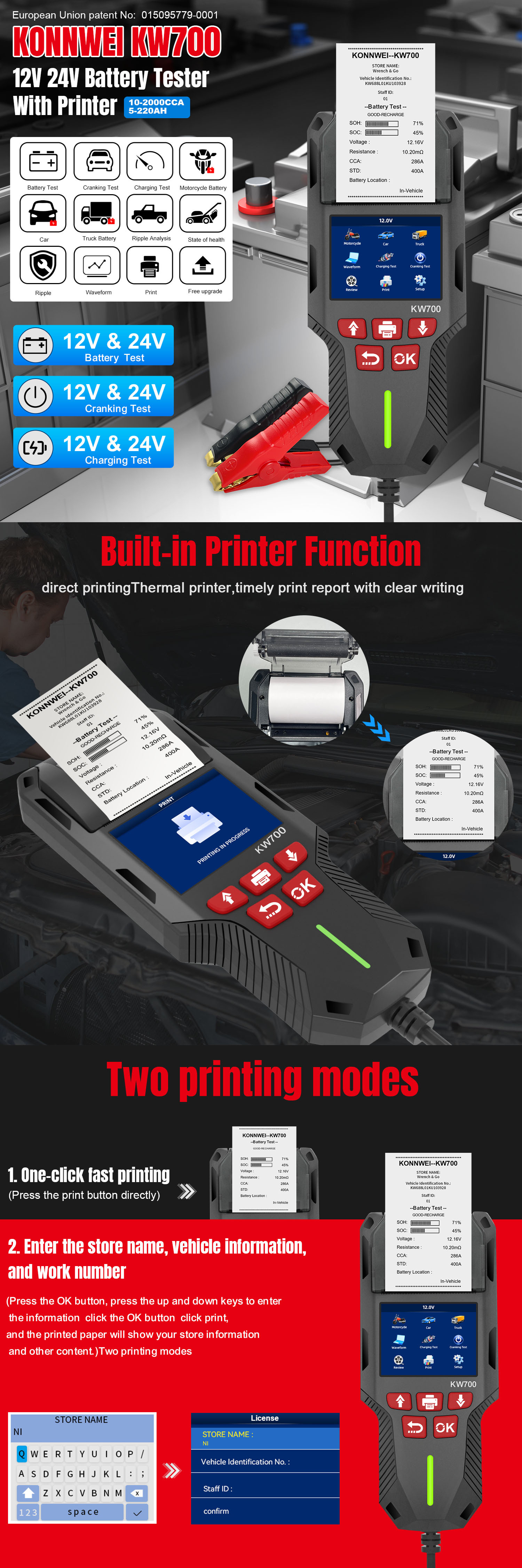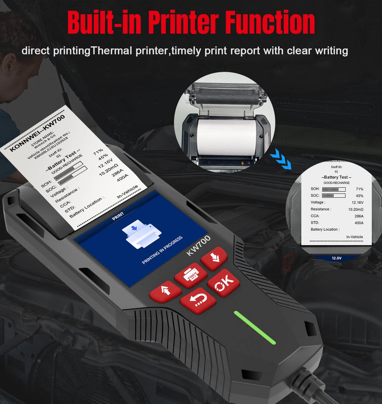 2. Built-In Printer: Integrated thermal printer delivers concise diagnostic reports instantly, allowing easy tracking of results for battery health and vehicle diagnostics.