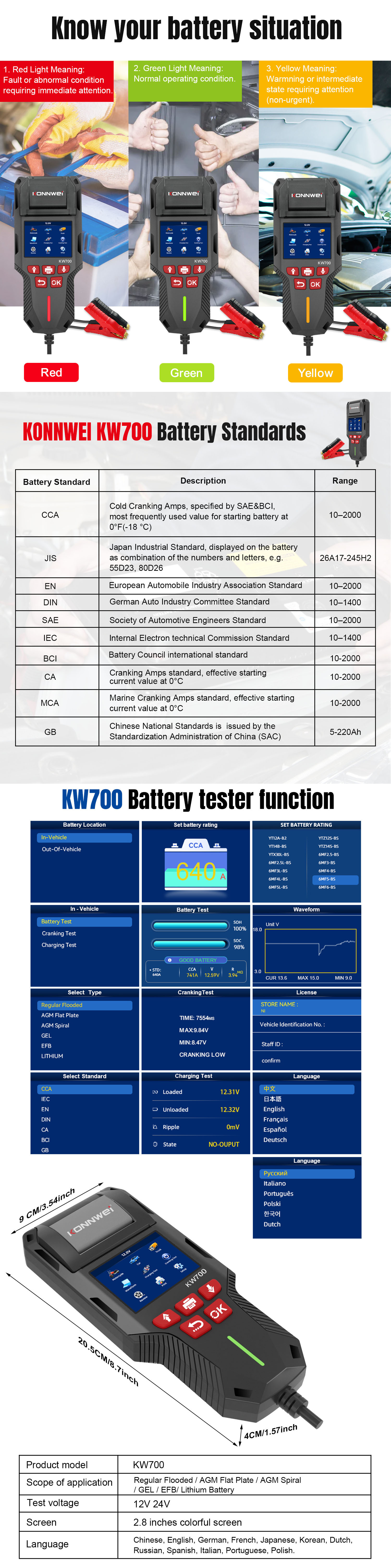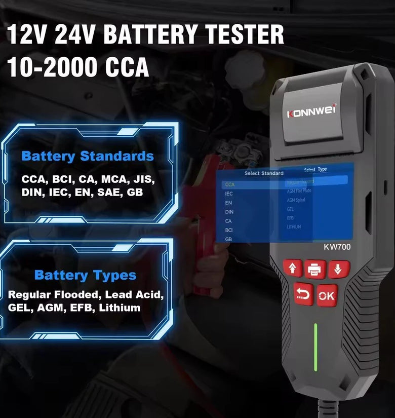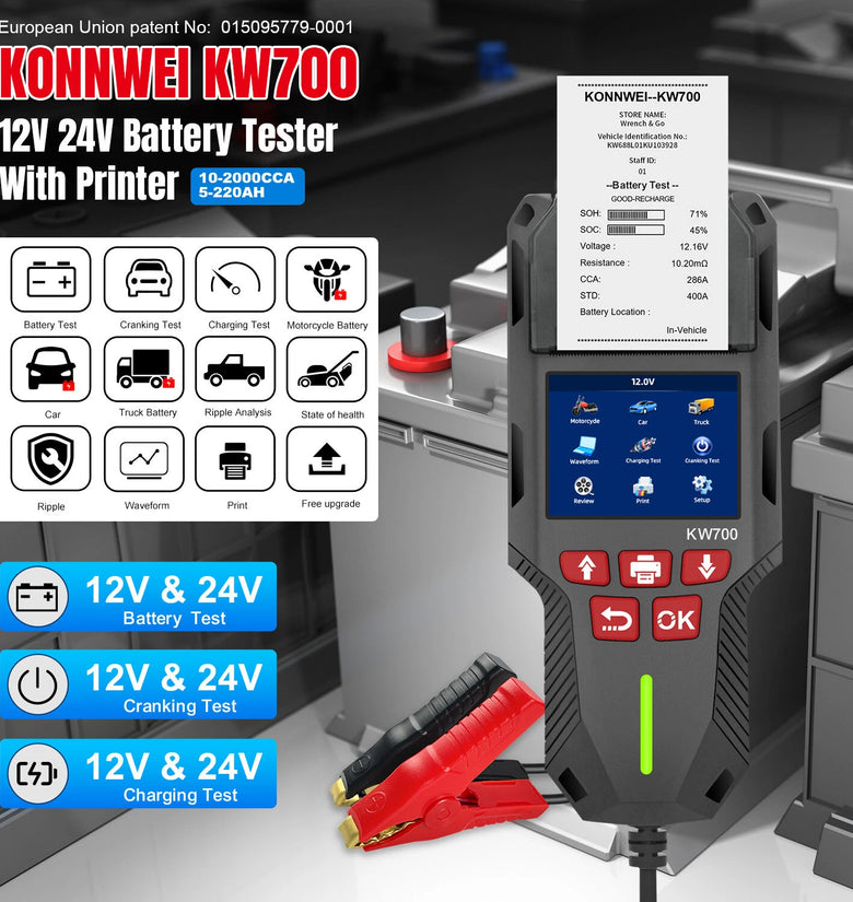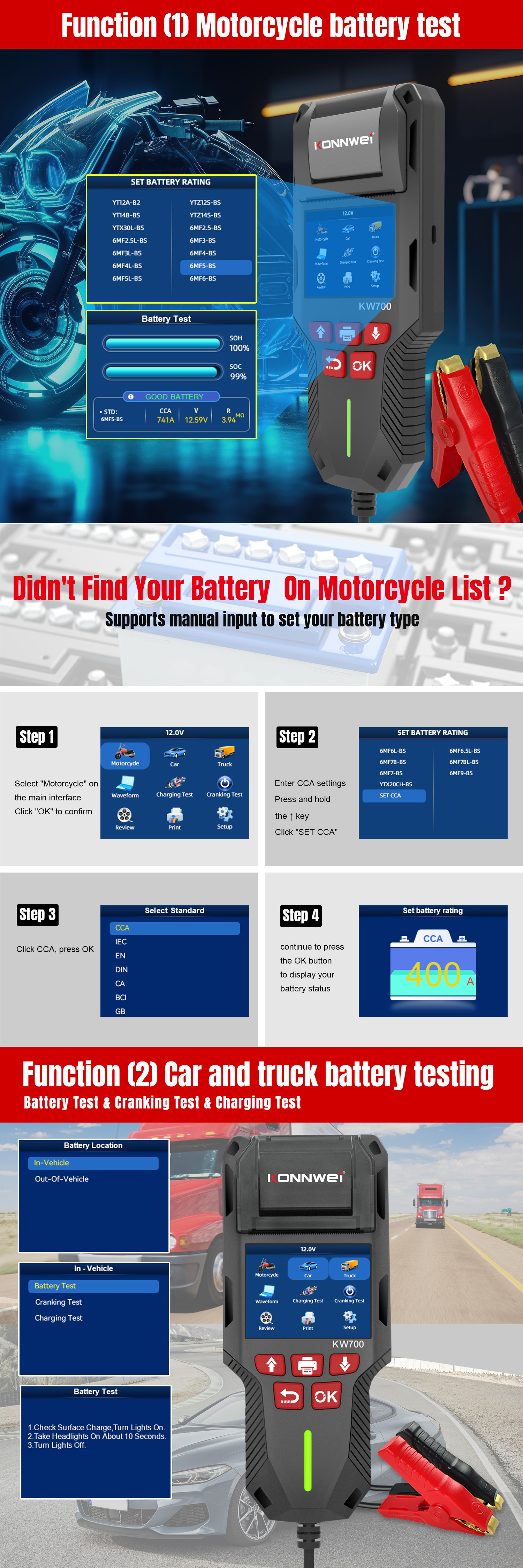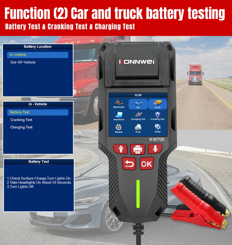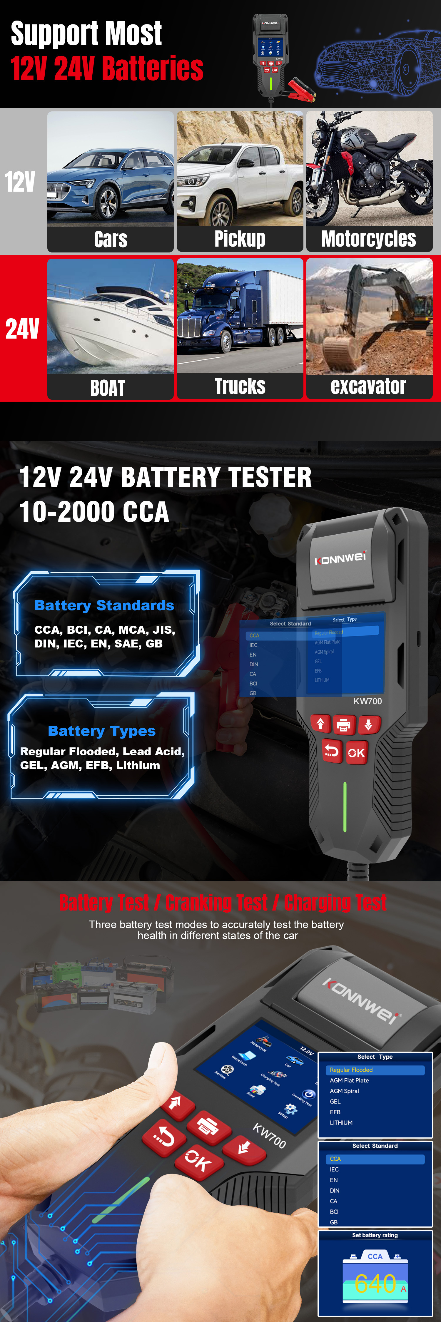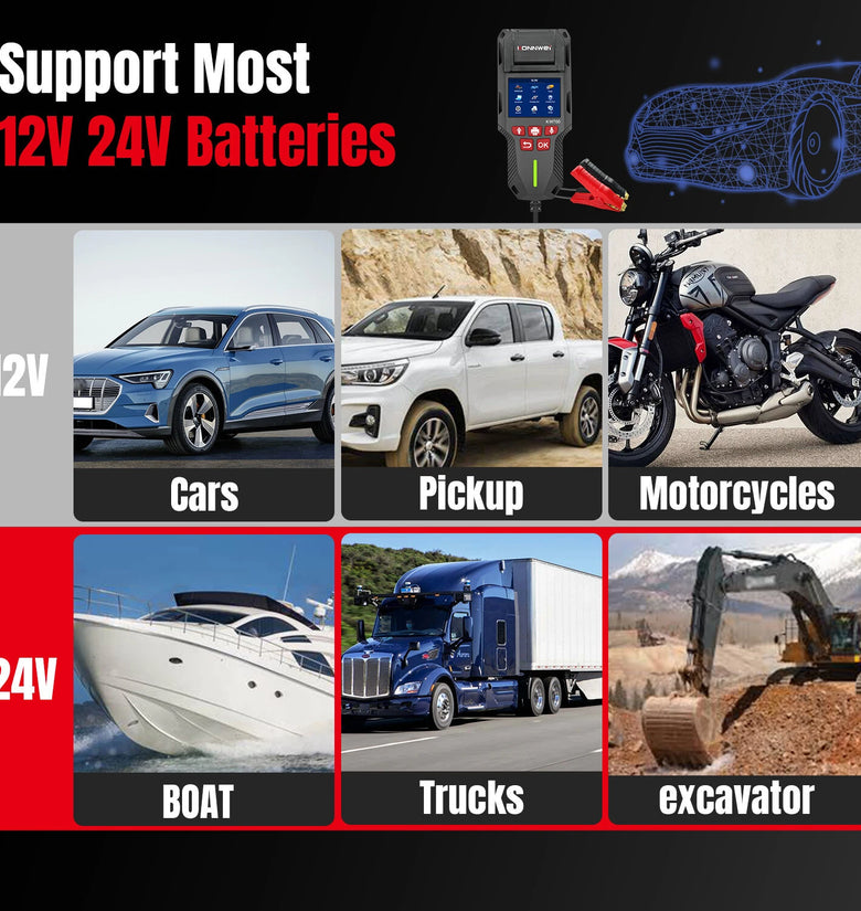 1. Wide Compatibility: Advanced testing capabilities for 12V and 24V batteries, supporting cars, trucks, boats, motorcycles, and excavators. Suitable for various battery types, including AGM, Lithium, and GEL batteries.