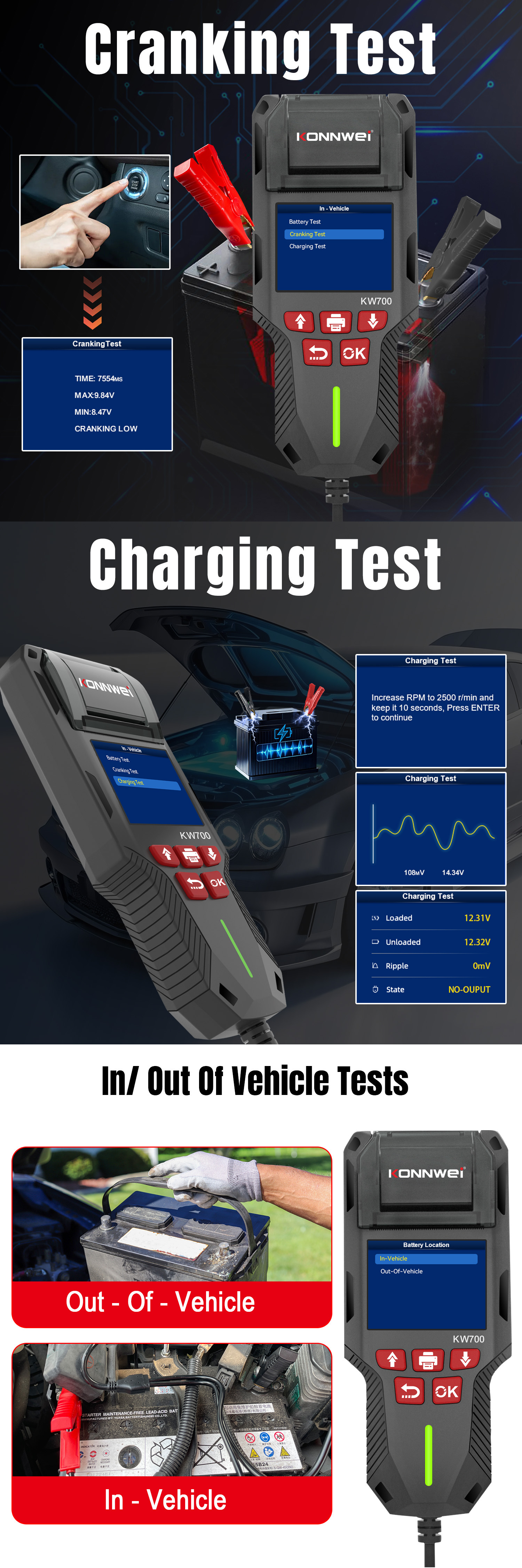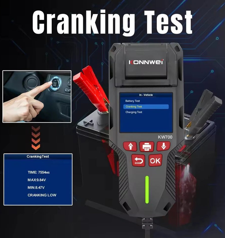 3. Multi-Test Modes: Conduct battery tests, cranking tests, and charging evaluations to determine battery efficiency and vehicle performance under different conditions.
