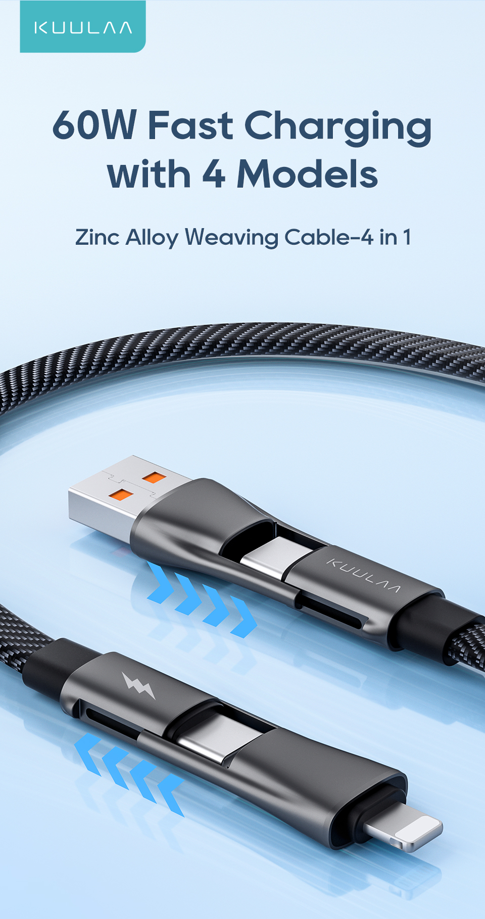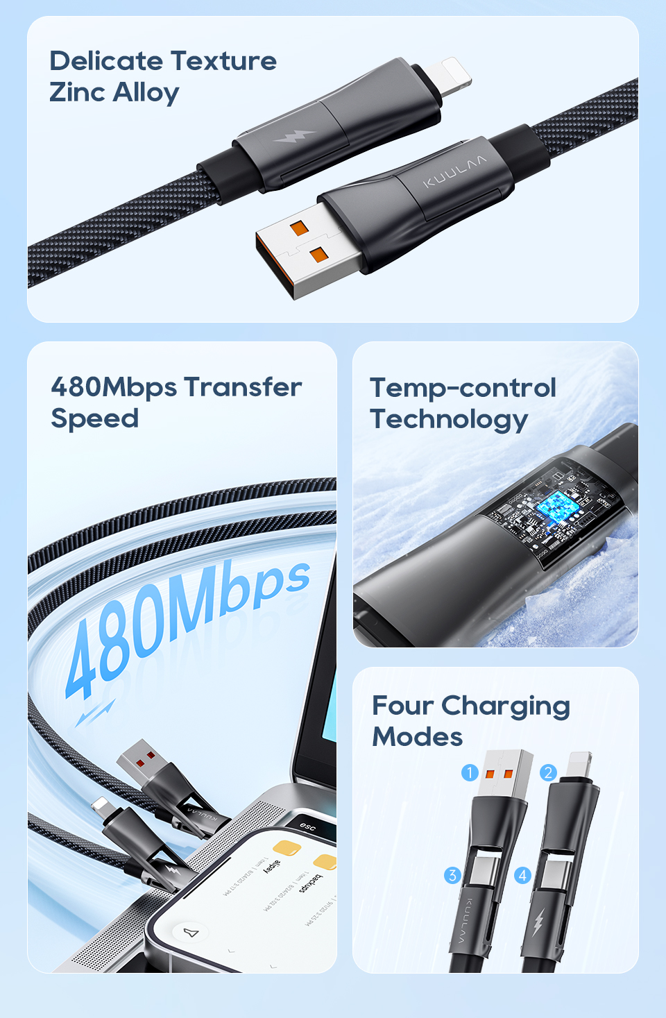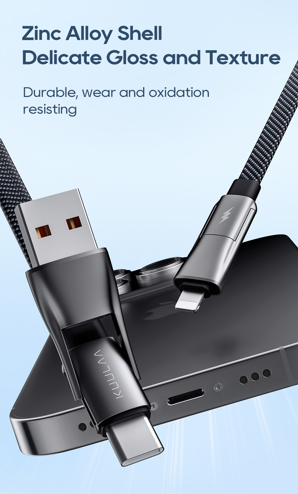 1. Various Charging Modes: The KUULAA KL-X73 cable supports four types of charging modes, including USB-A to USB-C, USB-C to USB-C, USB-A to iP, and USB-C to iP.