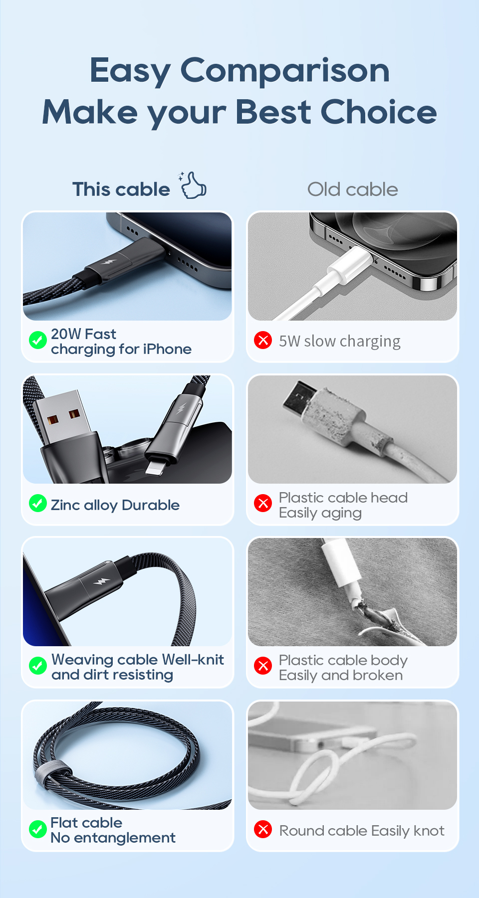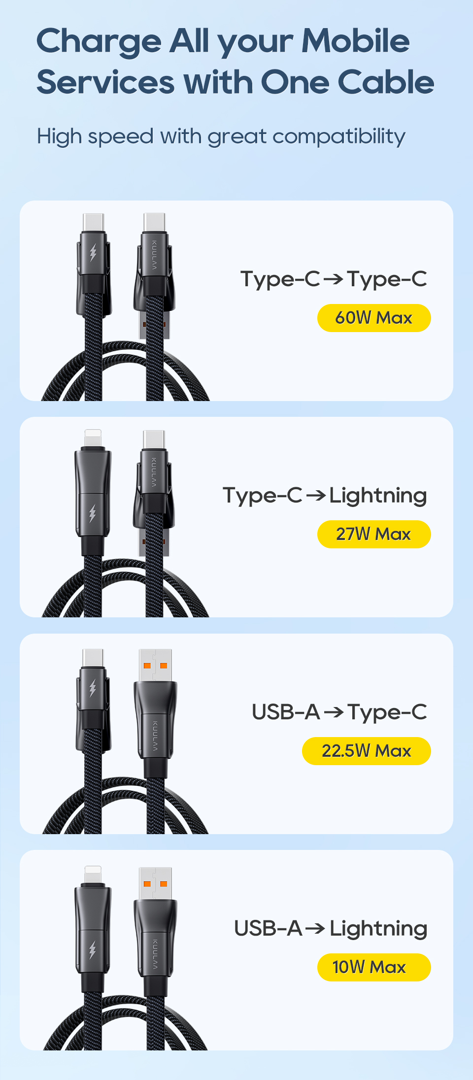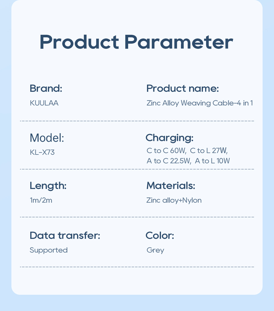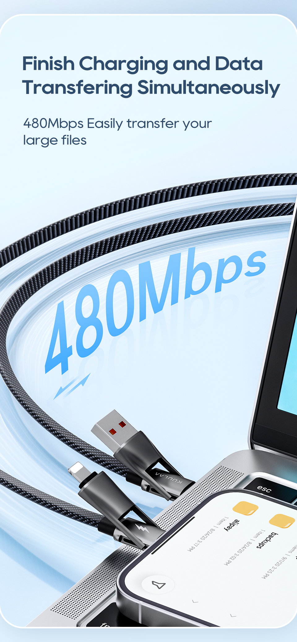 1. Various Charging Modes: The KUULAA KL-X73 cable supports four types of charging modes, including USB-A to USB-C, USB-C to USB-C, USB-A to iP, and USB-C to iP.