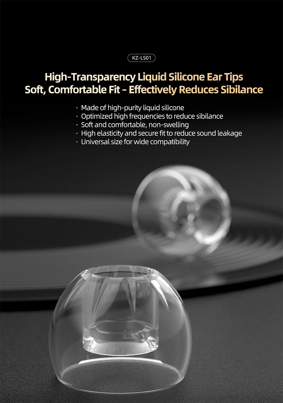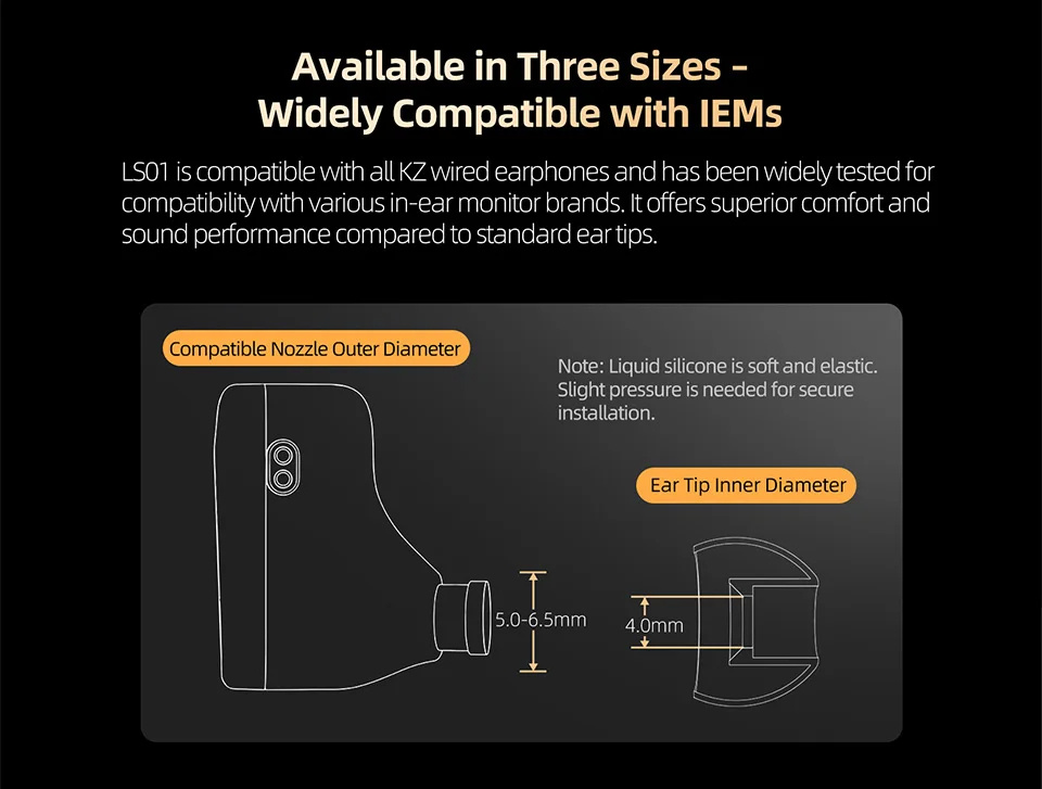 3. Universal Fit: KZ LS01 ear tips boast a versatile design that's compatible with an extensive array of in-ear monitors (IEMs). Featuring a 4mm nozzle and compatible nozzle outer diameter of 5-6.5mm. This universality enables listeners to enhance their current audio equipment with ease, providing an instant upgrade to your listening journey.