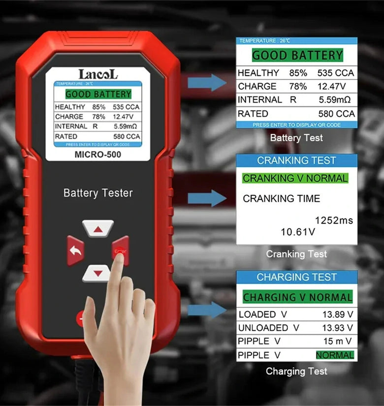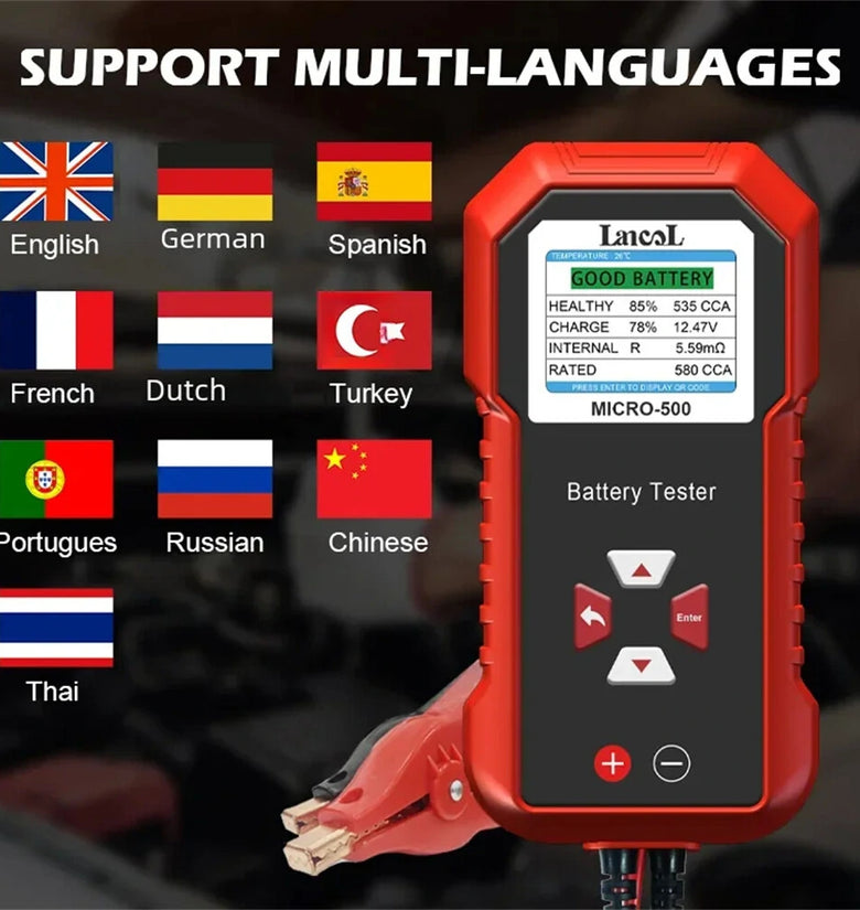 mso-bidi-font-family:'Times New Roman';font-size:10.5000pt;mso-font-kerning:1.0000pt;'>Advanced Conductivity Testing Technology: The Lancol MICRO-500 Battery Tester employs the world’s most advanced conductivity testing technology to accurately and quickly assess the state of your battery and system. This results in precise diagnostic results for 12V Lead-Acid batteries including AGM, GEL, SPIRAL, and SLI, as well as 12V lithium batteries. With its capability to conduct uninterrupted tests without heating, it ensures reliable performance over extended testing periods.mso-bidi-font-family:'Times New Roman';font-size:10.5000pt;mso-font-kerning:1.0000pt;'>