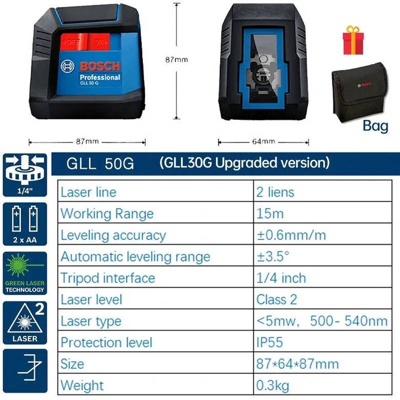 • Laser Level GLL50G 2-Line Self Levelling High Precision Instrument Horizontal Vertical Green Light Level for Construction