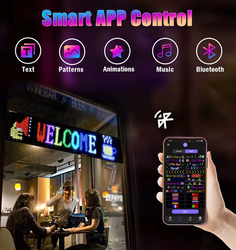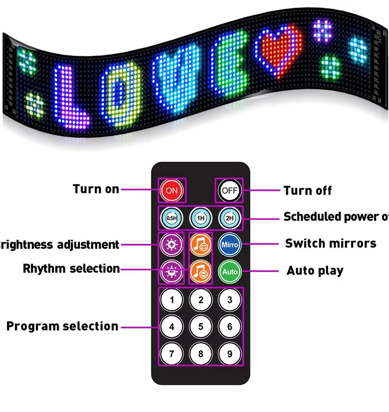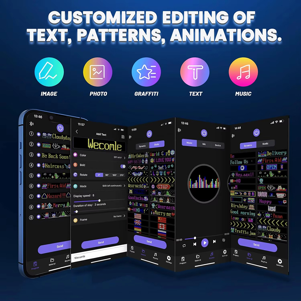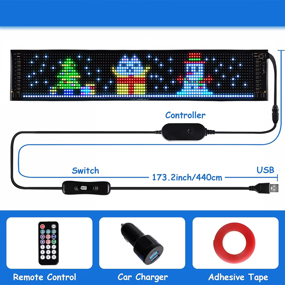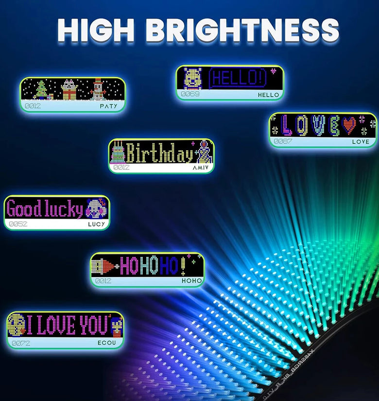 - Personalized Customization: Controllable via a Bluetooth app, users can customize text, patterns, and animations. This feature includes a timing function to manage display duration and a controller to adjust screen brightness and display settings effortlessly.