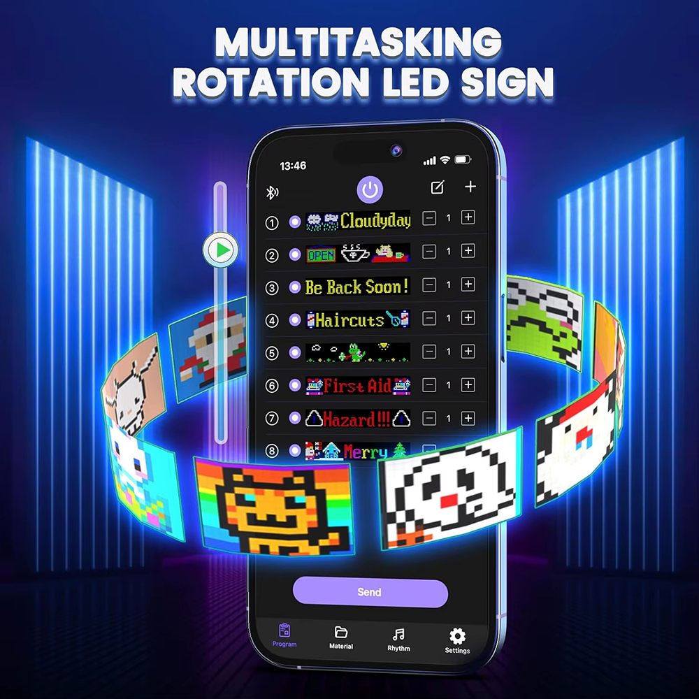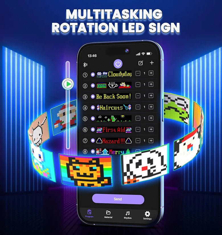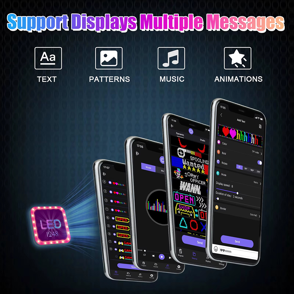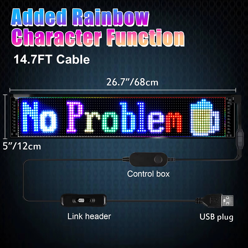 - Personalized Customization: Controllable via a Bluetooth app, users can customize text, patterns, and animations. This feature includes a timing function to manage display duration and a controller to adjust screen brightness and display settings effortlessly.