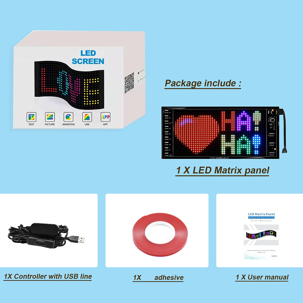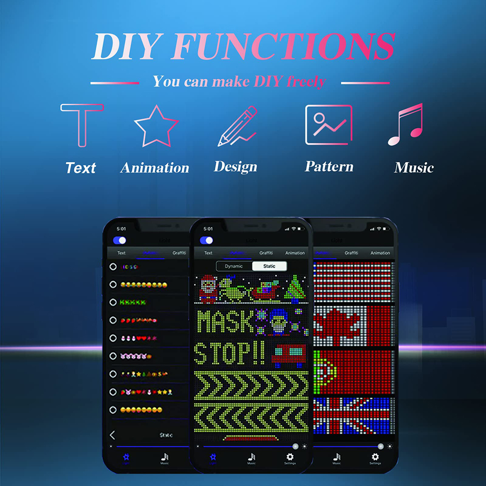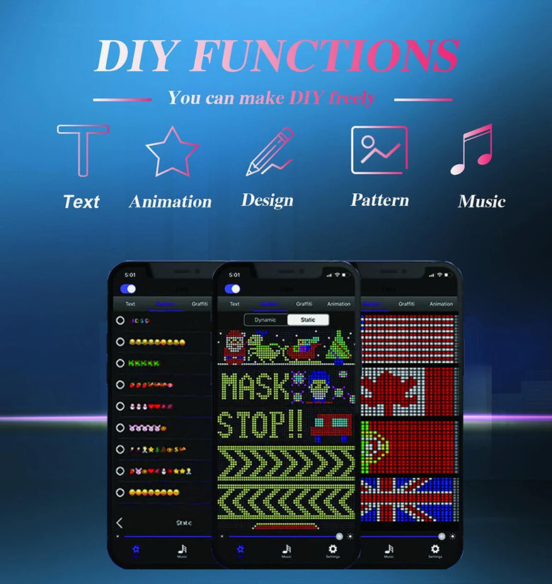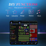 - Smart APP Control: Easily download the dedicated APP to your smartphone and connect to the LED matrix panel via Bluetooth. This feature supports various material formats and offers a smart scrolling display, allowing you to freely design and edit text, patterns, and animations according to your needs.