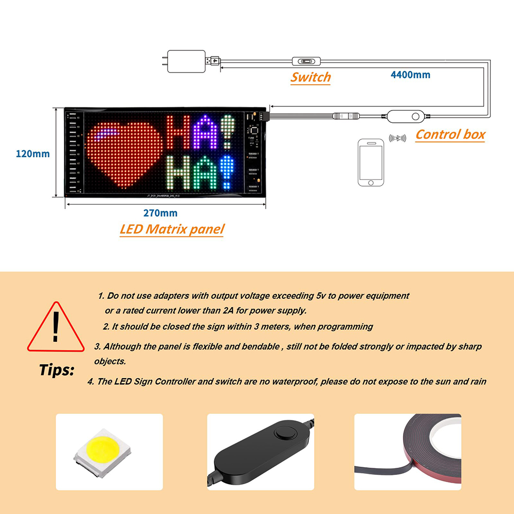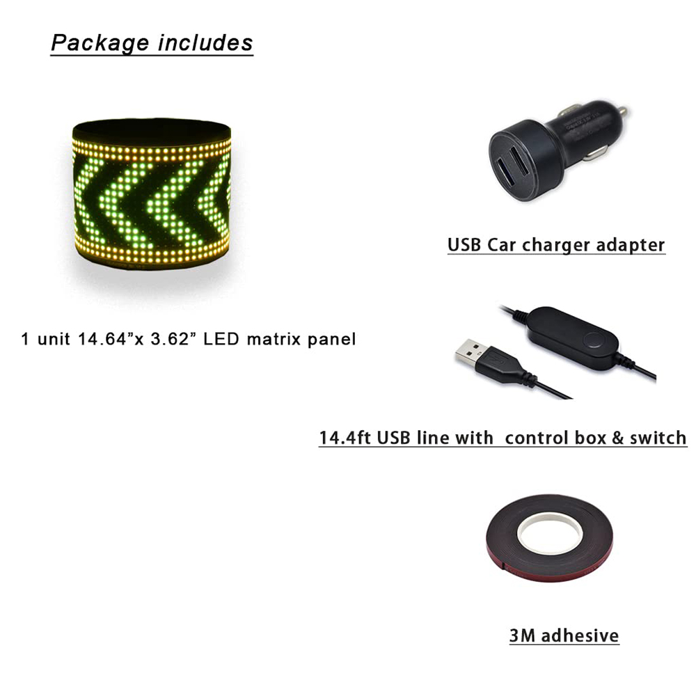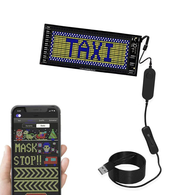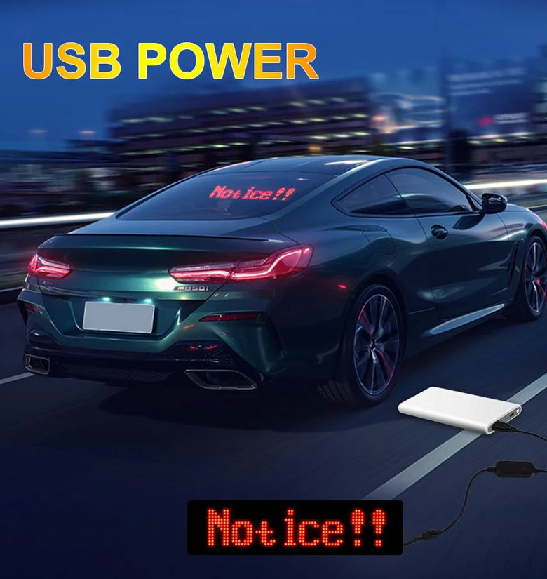 - USB Power: Equipped with a USB port for convenience and safety, and comes with cable. The LED matrix panel requires a 5V/2A AC/DC adapter or power bank. It can also be powered using a 5V/2A car power outlet when used in a vehicle, making it highly versatile.
