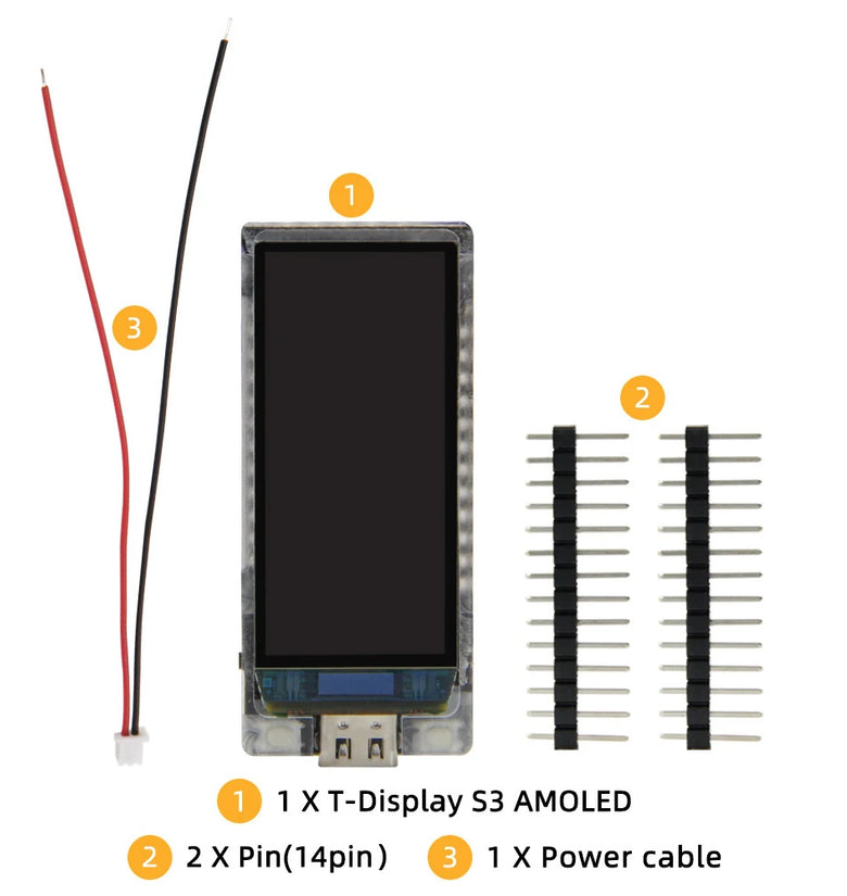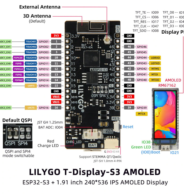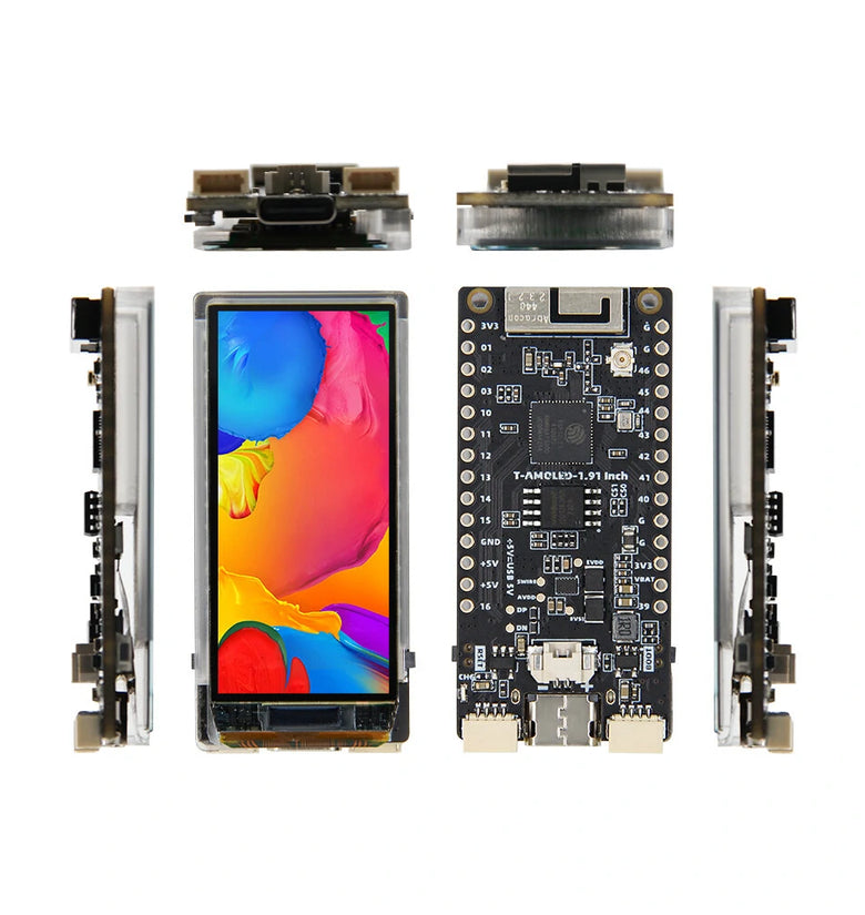 T-Display-S3 AMOLED Introduction:The T-Display-S3 AMOLED is an upgraded development board from the T-Display-S3, featuring the first ESP32-S3+AMOLED combination. It has upgraded from an LCD to an AMOLED display, providing better color display. Additionally, it has upgraded from an SPI to a QSPI interface for faster speed, and from an onboard antenna to a 3D antenna for an improved WiFi and Bluetooth experience.