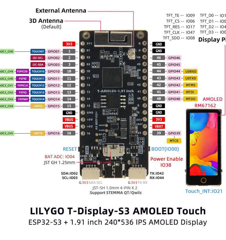 T-Display-S3 AMOLED Introduction:The T-Display-S3 AMOLED is an upgraded development board from the T-Display-S3, featuring the first ESP32-S3+AMOLED combination. It has upgraded from an LCD to an AMOLED display, providing better color display. Additionally, it has upgraded from an SPI to a QSPI interface for faster speed, and from an onboard antenna to a 3D antenna for an improved WiFi and Bluetooth experience.