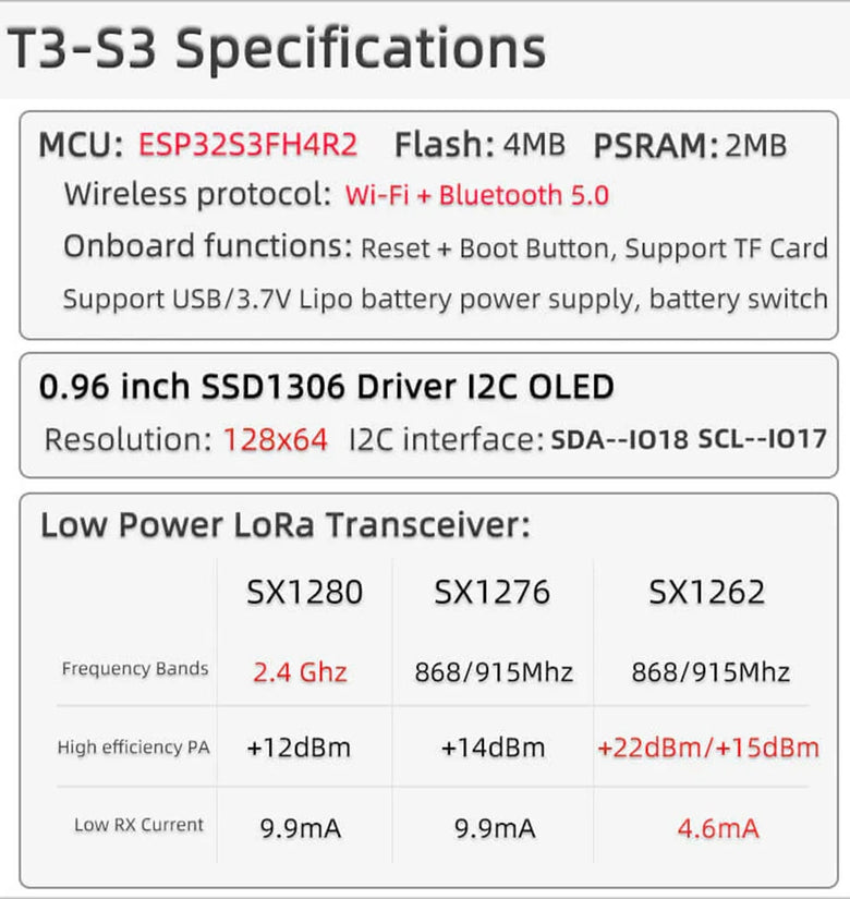 • LILYGO T3S3 ESP32-S3 LoRa Development Board with Speaker 0.96 Inch OLED WiFi Bluetooth Low Power SX1262 SX1276 868MHz 915MHz SX1280 2.4GHz IoT Compatible