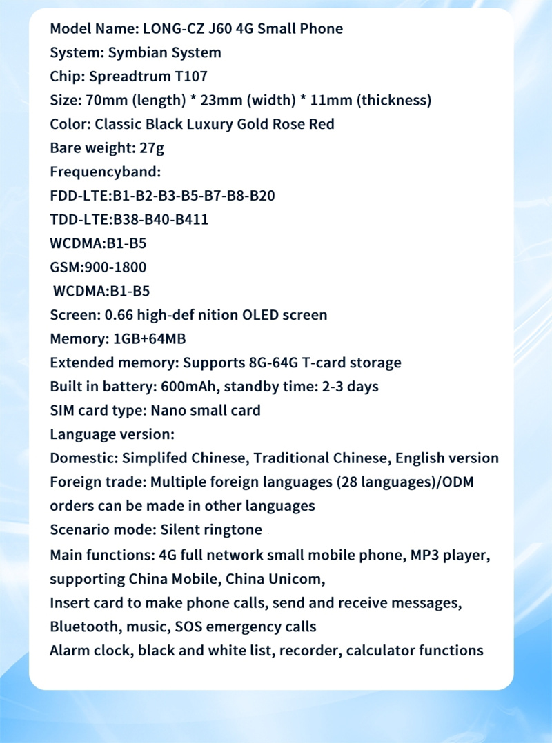 CPU: Spreadtrum T107 SIM Card Type: Nano small card Card Extend: Supports an external T-card up to 8-64G |