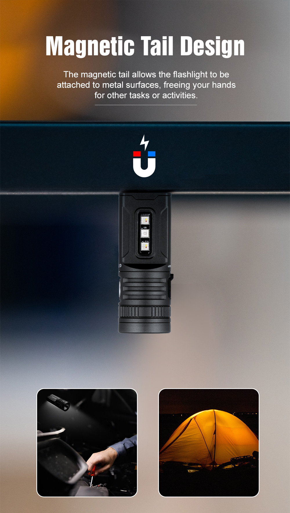 4.Blinks: Triple-click the switch to enter strobe mode. Another triple-click will change the blinking modes(SOS, Beacon, Strobe) .