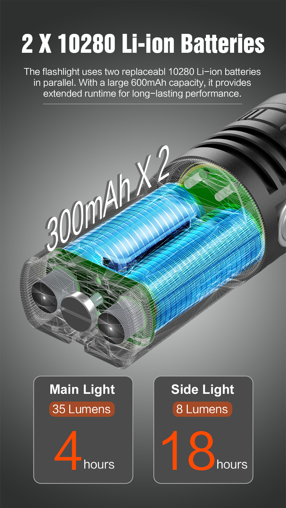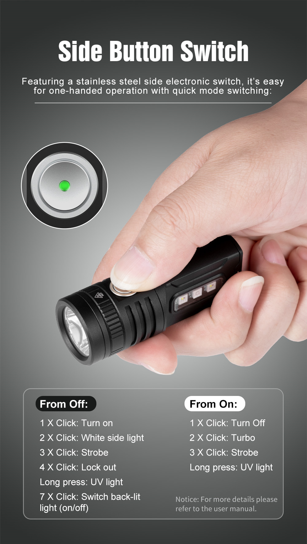 7.Lock-out/Unlock: Quadruple-click the switch from OFF. In lock-out mode, momentary ON is available by pressing the switch.