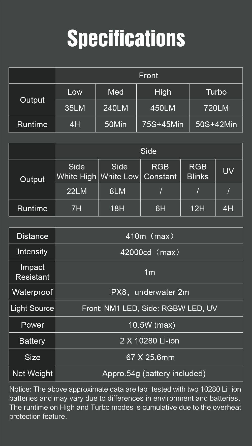Special Modes: Turbo, Strobe, SOS, Beacon.