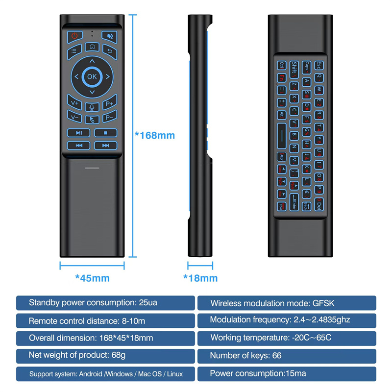 4. 7 Color Backlit Keyboard: The remote comes with multiple backlight colors, which can be switched using Fn + Space, enhancing visibility in low-light conditions.