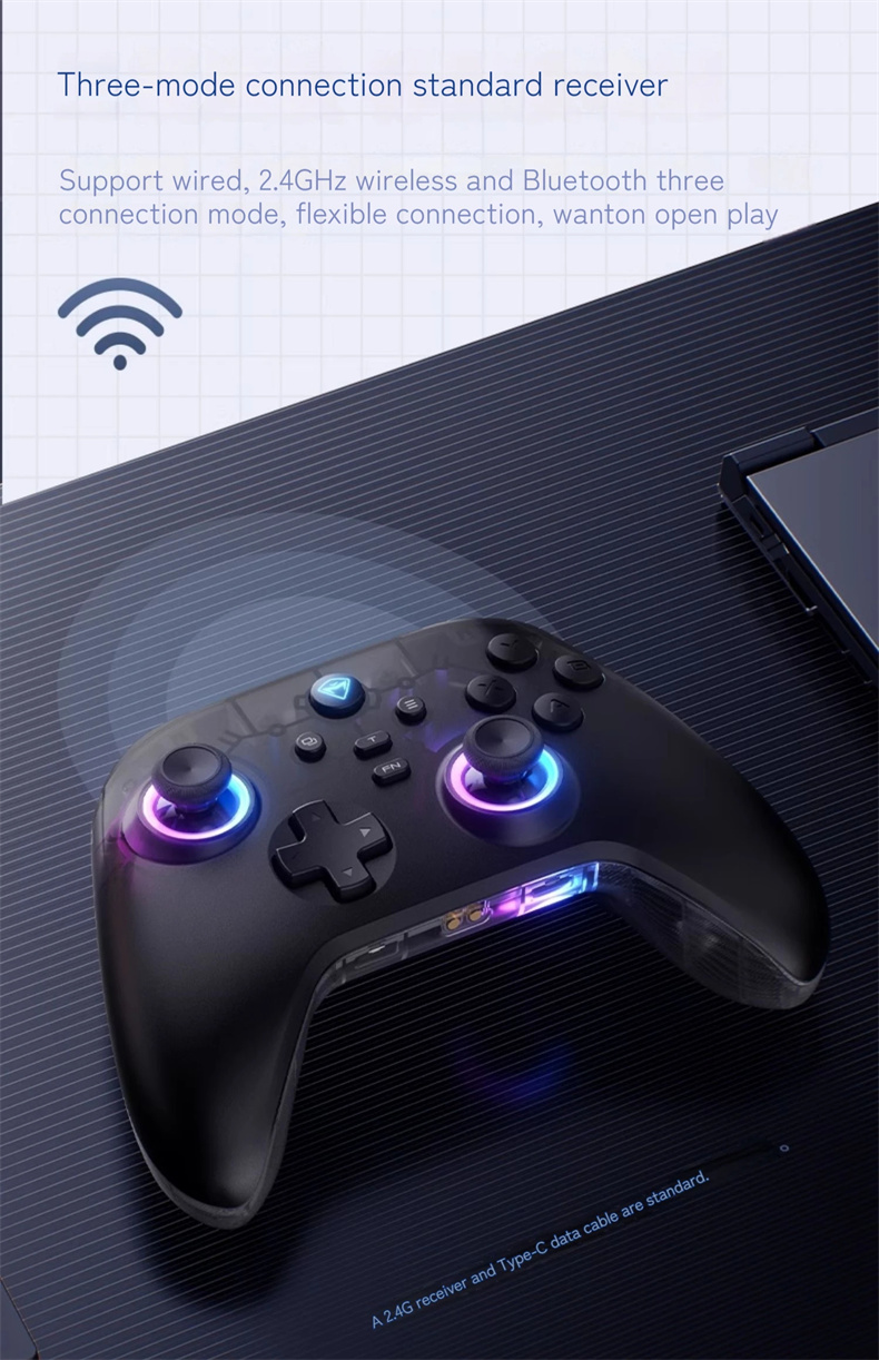 1. Tri-mode Connection: Seamlessly switch between wired, 2.4G, and bluetooth modes for versatile gaming experiences across multiple devices.