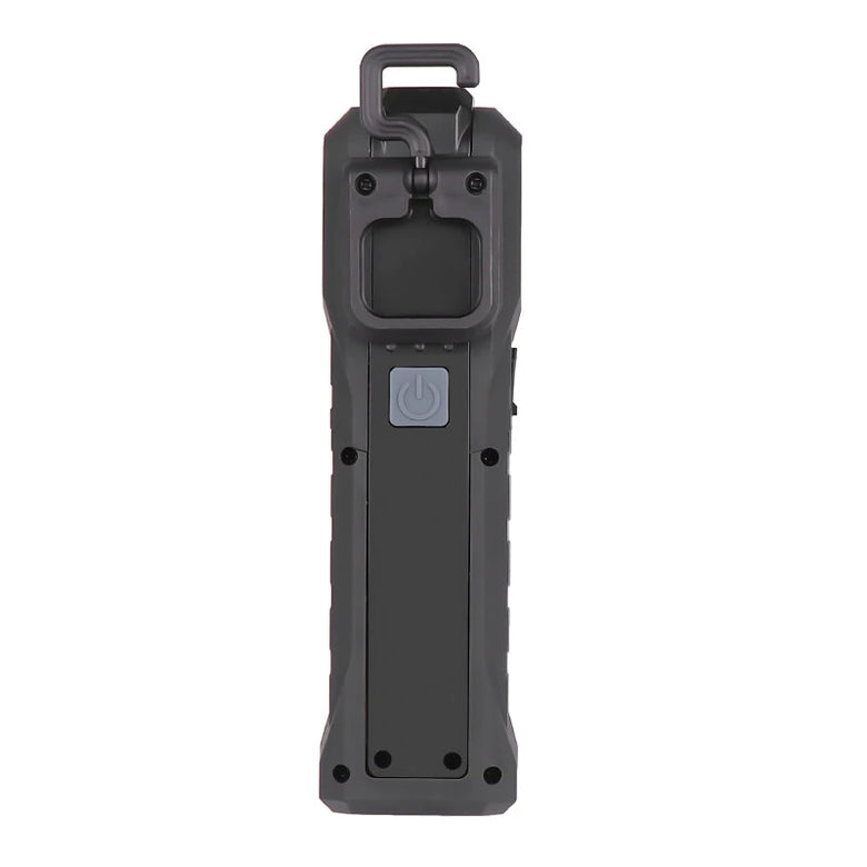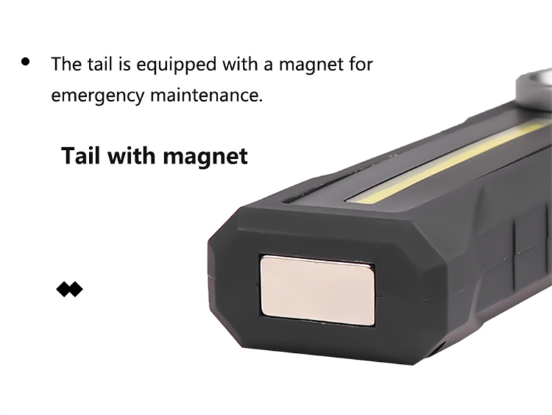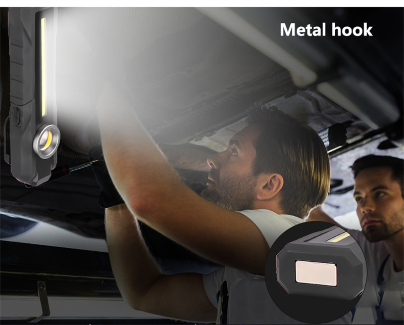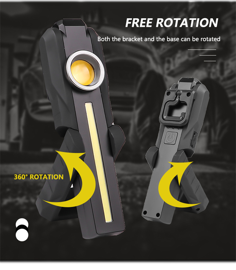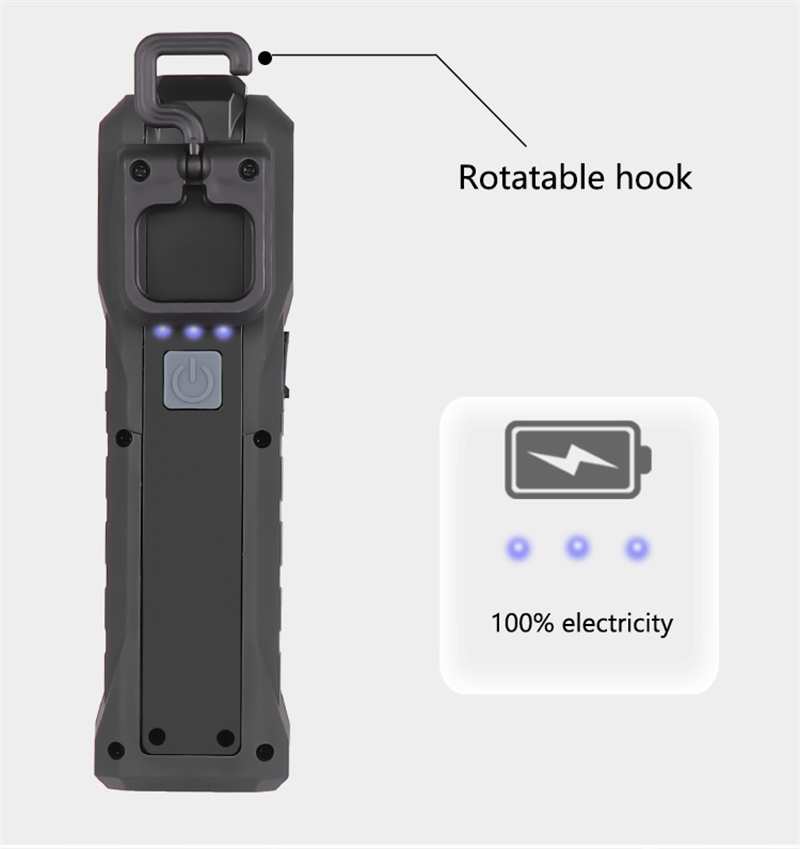 2.180 degree Rotate & Magnet & Hook: The base of the work light can rotate 180 degree , you could hold it in your hand or place it on the ground. Suitable for multi-angle illumination. With magnet and hook at the bottom, the work light can on any kind of iron product or hang it elsewhere, leaving your hands free to do other work at night.
