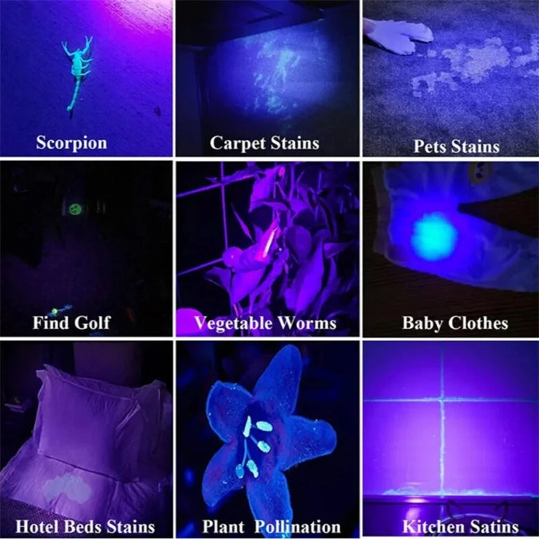 1.4 Lighting Modes: This work light adopts a high-quality 3W LED + 5W COB light bulb, with 4 kinds of lighting modes: LED light / COB UV light / COB white light / long press COB white light flash. Unique 395nm wavelength UV LED Light design, could work as a portable pet (dog/cat) urine detect light, scorpion finder, fluorescent detect, and it can also be used to check clean levels in carpets, kitchens, toilets, etc.