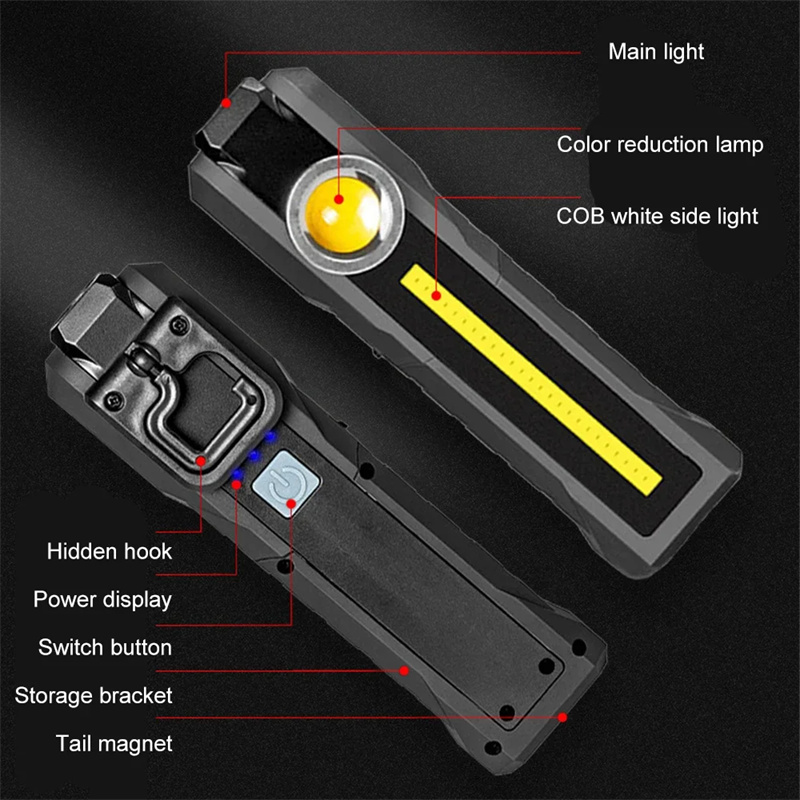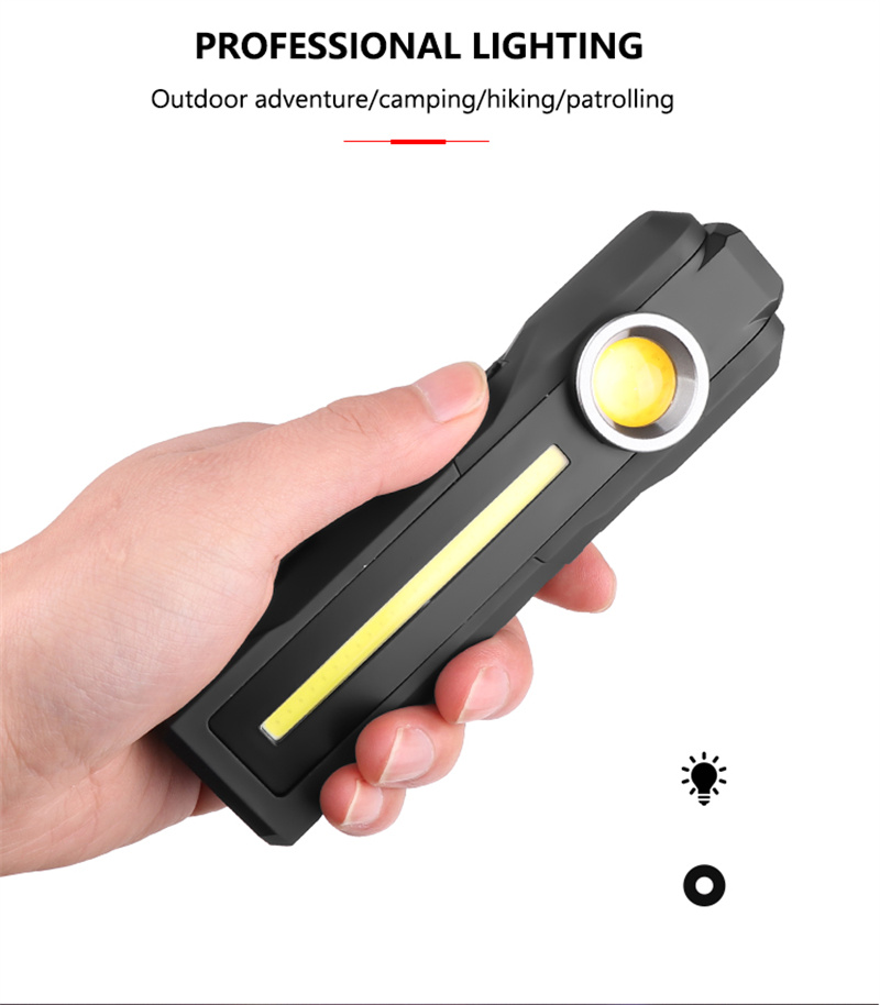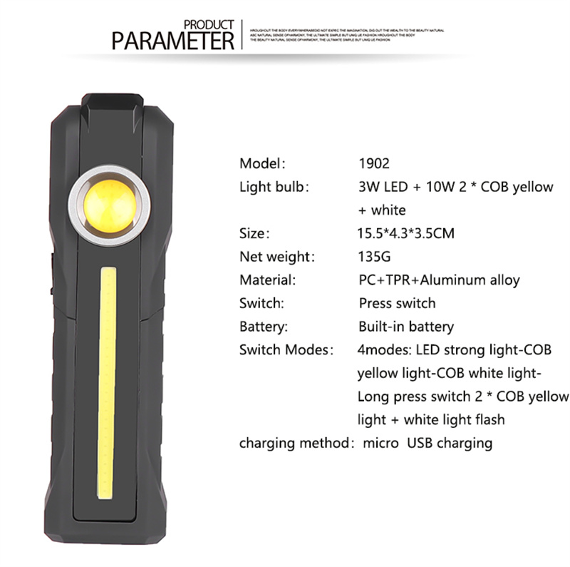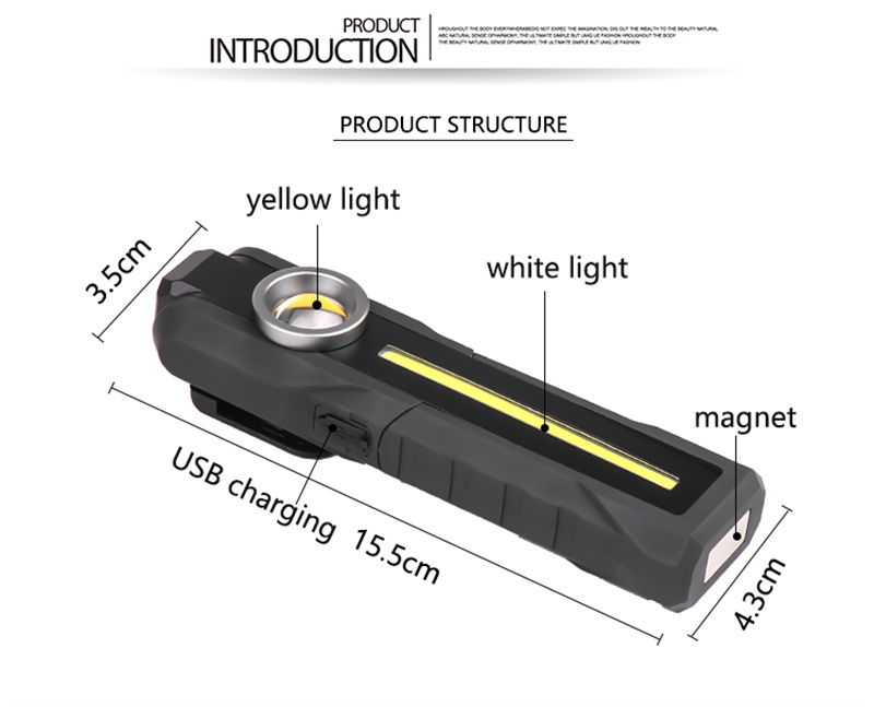 4Modes: LED Strong Light-COB Yellow Light-COB White Light-Long Press Switch 2 * COB Yellow Light + White Light Flash |