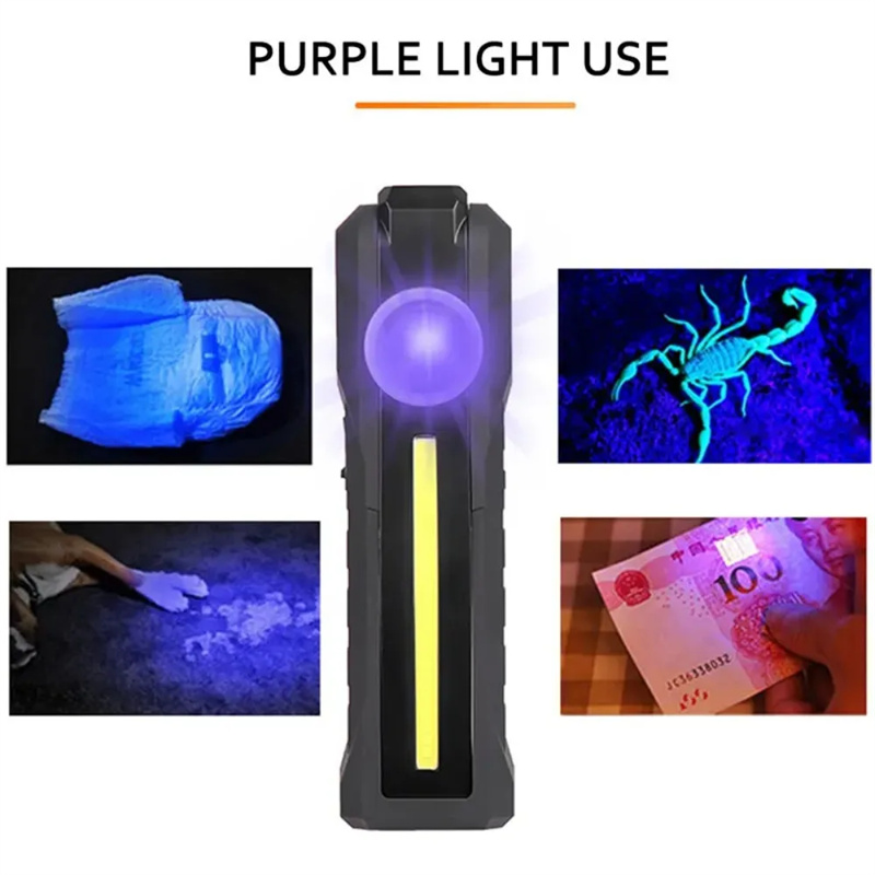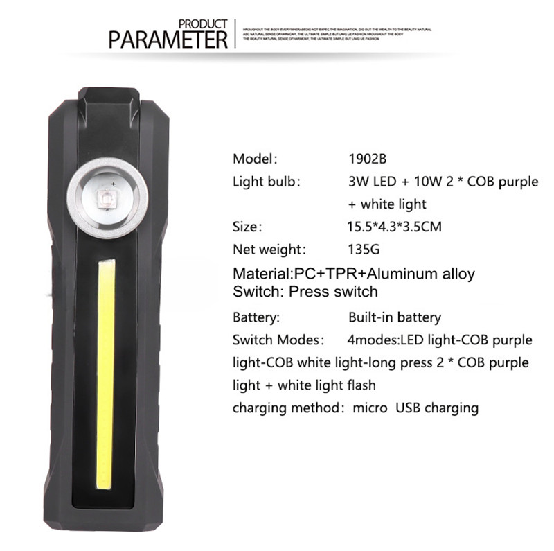 4 Modes:LED Light-COB Purple Light-COB White Light-Long Press 2 * COB Purple Light + White Light Flash |