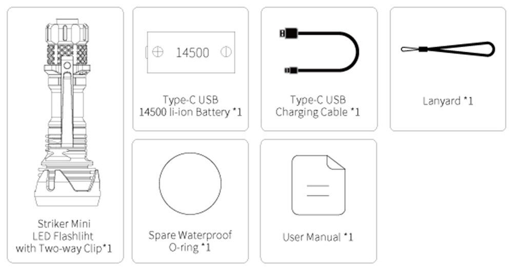 635 lm / 50 lm / 635 lm (20Hz) (powered by 14500 USB-C Li-ion Battery)