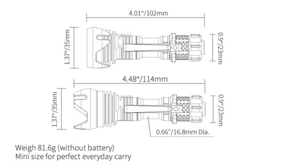 102 mm (Length) x 35 mm (Head diameter) x 16.8 mm (Body diameter) x 23 mm (Tail diameter)