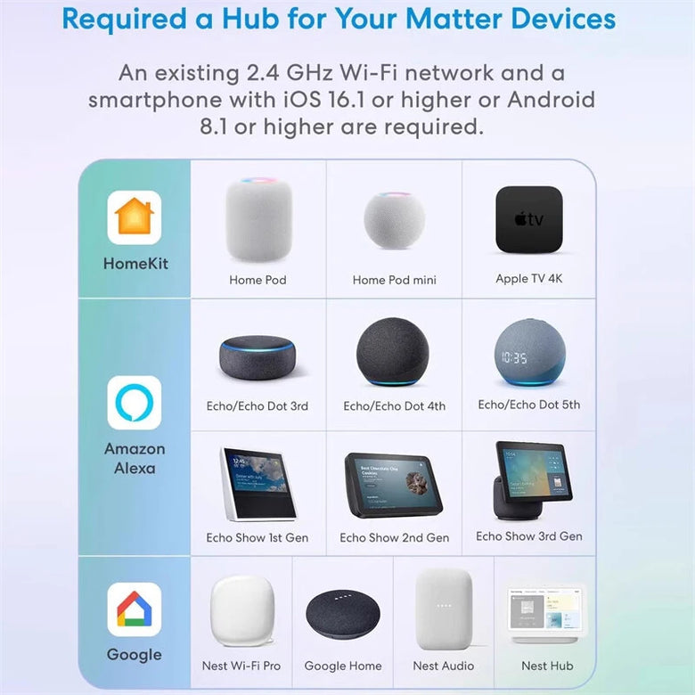 2. Apple Home Integration: Supports Apple's ecosystem via Matter, enabling control and automation through the Apple Home app. Note: Requires iOS 17.4+ and HomePods V17.4+.