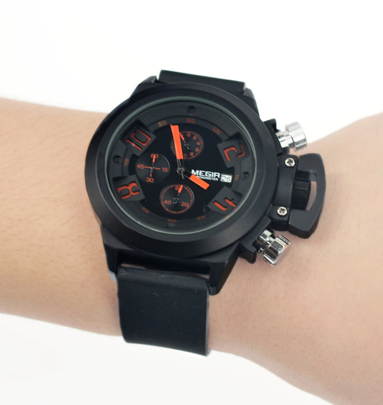 Specifications: Brand: MEGIR Movement: Quartz Movement Gender: Men Display: Analog Band Material: Silicone Case Thickness:15mm Band Width:22mm Band Length:225mm Water Resistance):3Bar Case Diameter:48mm Weight:About 128g