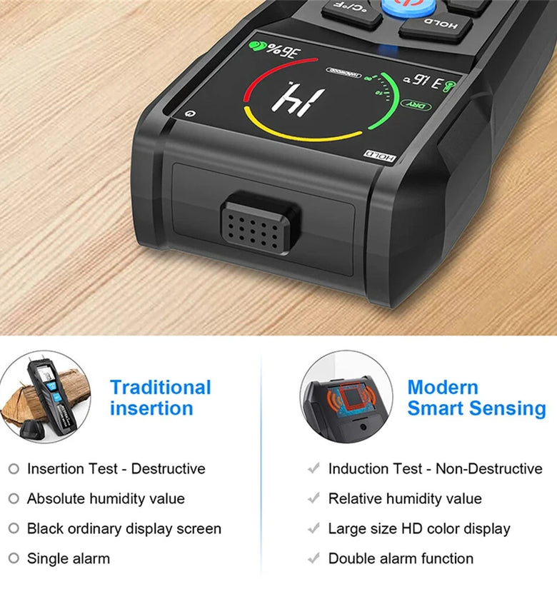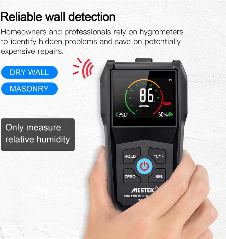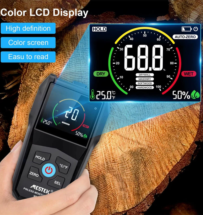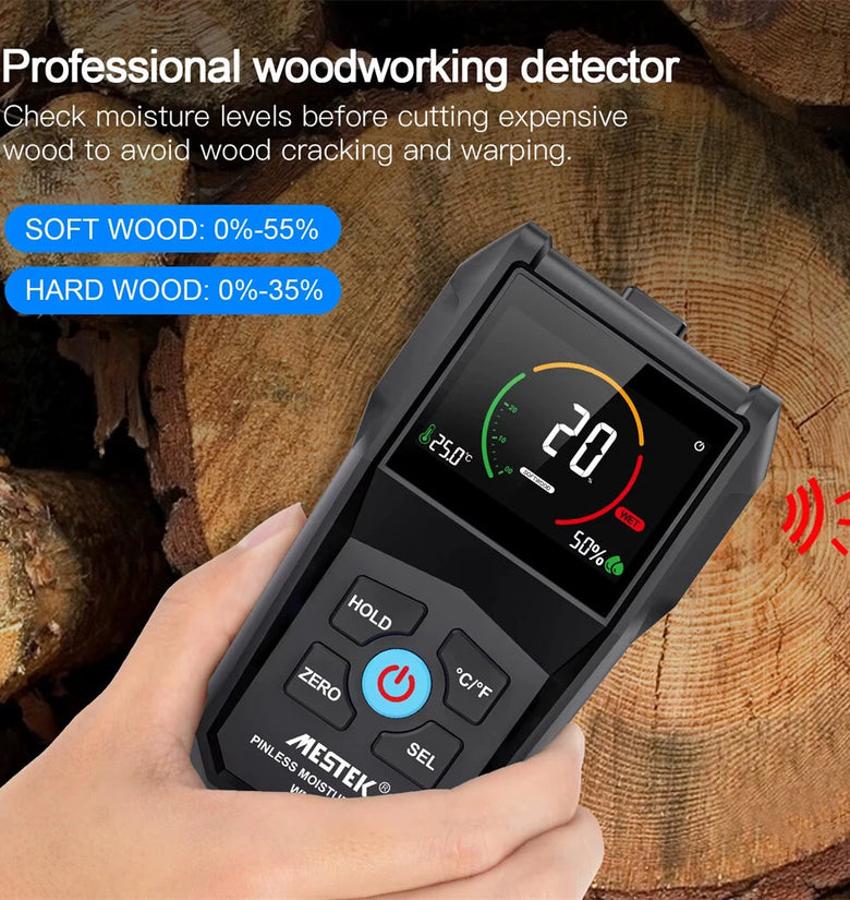 1.Multi-Material Usage: Equipped with 4 measurement modes—drywall, masonry, softwood, and hardwood—ideal for varied construction and woodworking applications.