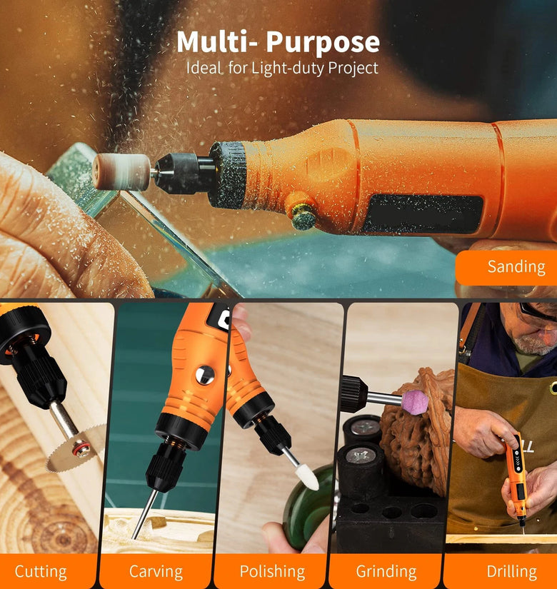 【Quick USB Charging, Longer Running Time】Rotary tool cordless comes with 3.7V rechargeable battery, can work continuously for 200 minutes. One charge can be used for multiple times, and the range is stress-free. Battery powered rotary tool make your work one after another. (The indicator light will turn green when it is fully charged)