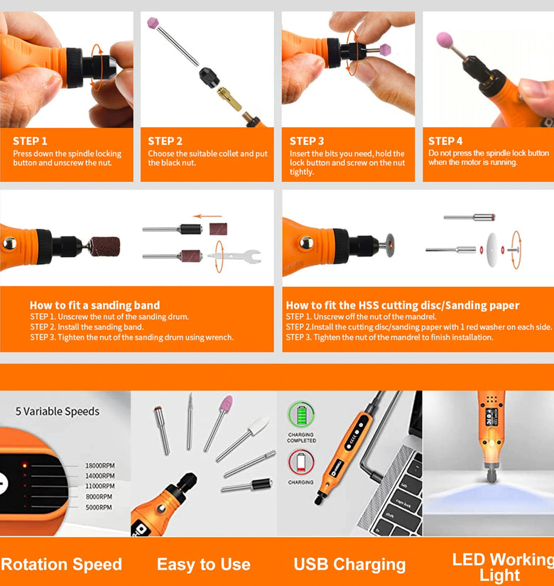 【Rotary Drill with LED Indicator】The upgraded small cordless rotary tool has a blind spot lighting LED design. Reduce backlight shadows and overcome the adverse effects of dark areas on the use of the drill for resin, and provide you with a better experience Cordless design: Cordless design of the rotary tool allows use anywhere without the need for an electrical outlet. USB Charging: Equipped with a Micro-USB power cord, making charging easier and more convenient. Spindle Lock: Onboard spindle lock makes for quick and easy bit changes. Variable Speed Tool: With 5 different levels of RPM, which can be adjusted from 5000 to 18000 RPM. Easy to use: You can grip it like a pen for ultimate control and precision as well as for comfort. Ergonomic streamlined design with overload power-off protection for safe and reliable operation.
